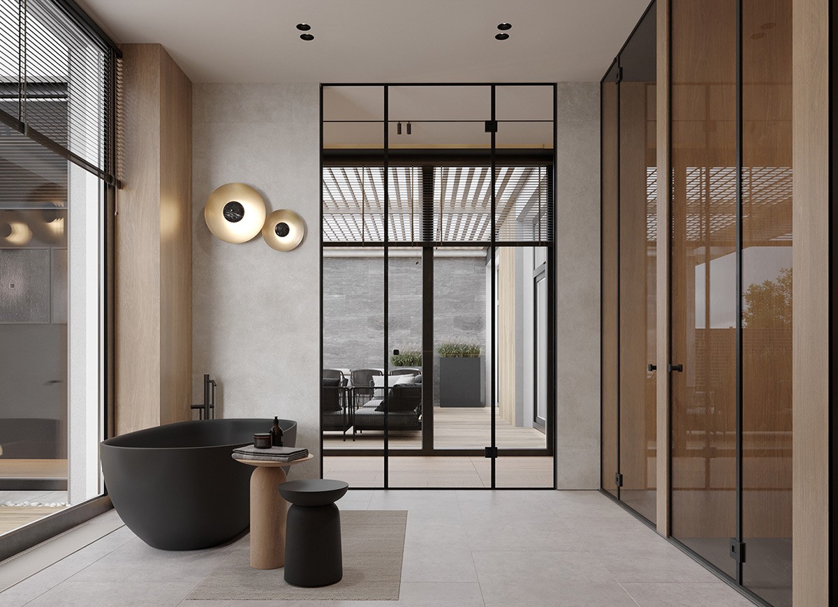 When a matte black standing tub is placed next to a massive window, the end result is a luxe spa-like bathroom.