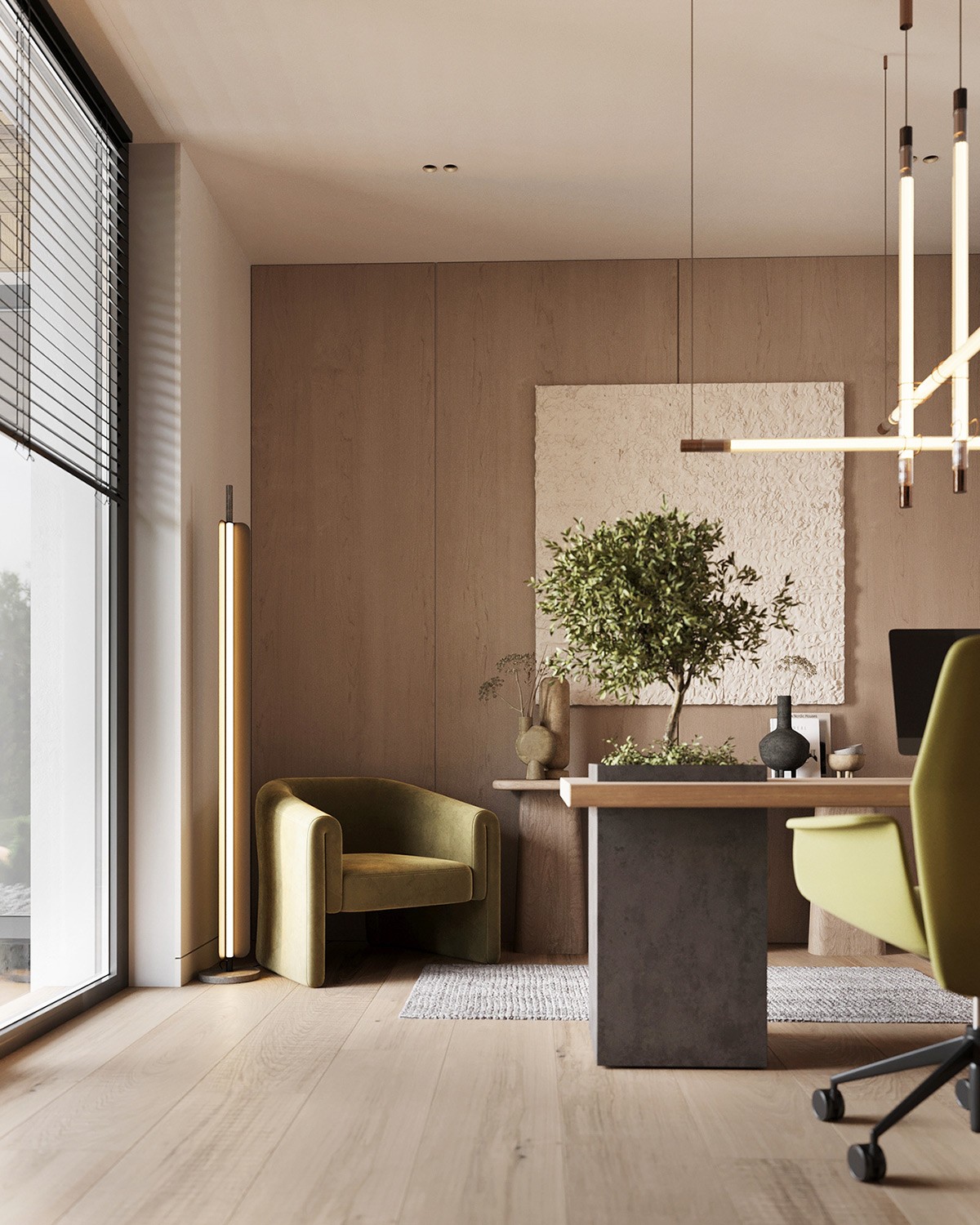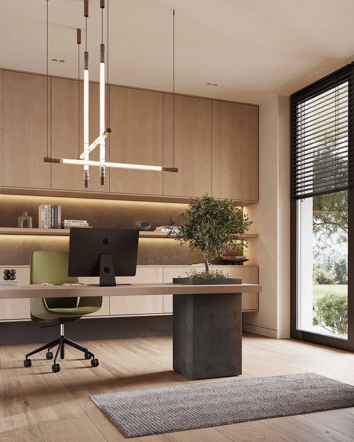 Who dreads work hours when the office looks like this? A wooden desk is paired with an ergonomic green chair. The standout feature is a small tree planted within a built-in planter on the desk 💚 Behind this setting, we see light oakwood cabinetry providing room to stock all essentials.