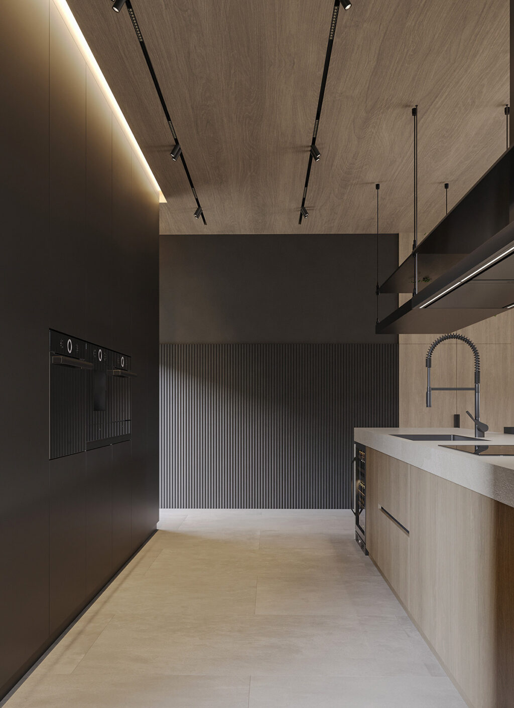 The kitchen sees a mix of warm wood and black accents (these factor in luxury). A mini bar provides ample room to store your favorite drinks. We especially love the hanging shelving—letting you store essentials while saving space.
