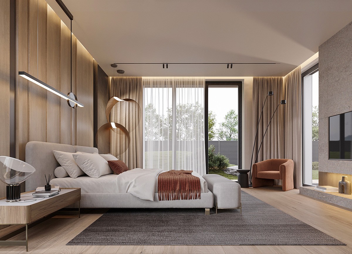 The floor-to-ceiling windows in the bedroom give scenic outdoor views (these smartly double as decor 😉). The floating nightstands are super-savvy—and equal parts classy. Finally, the interesting pendant lights and floor lamp add intrigue.