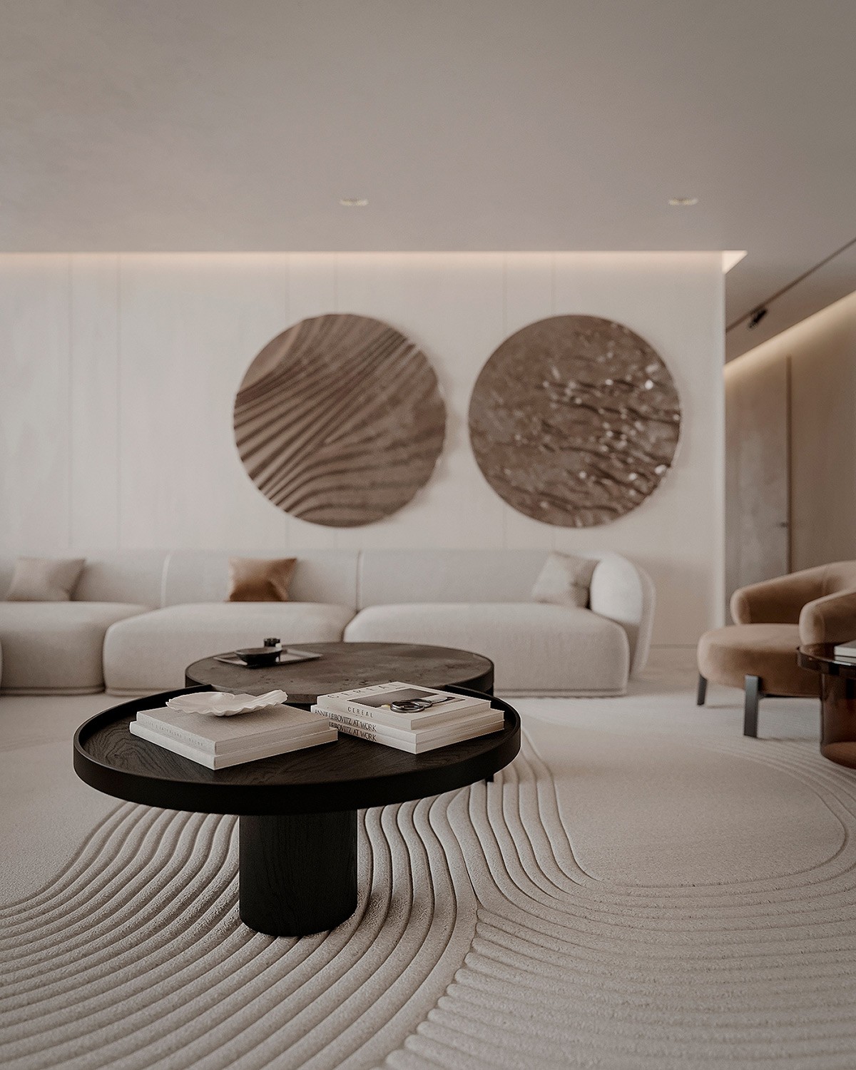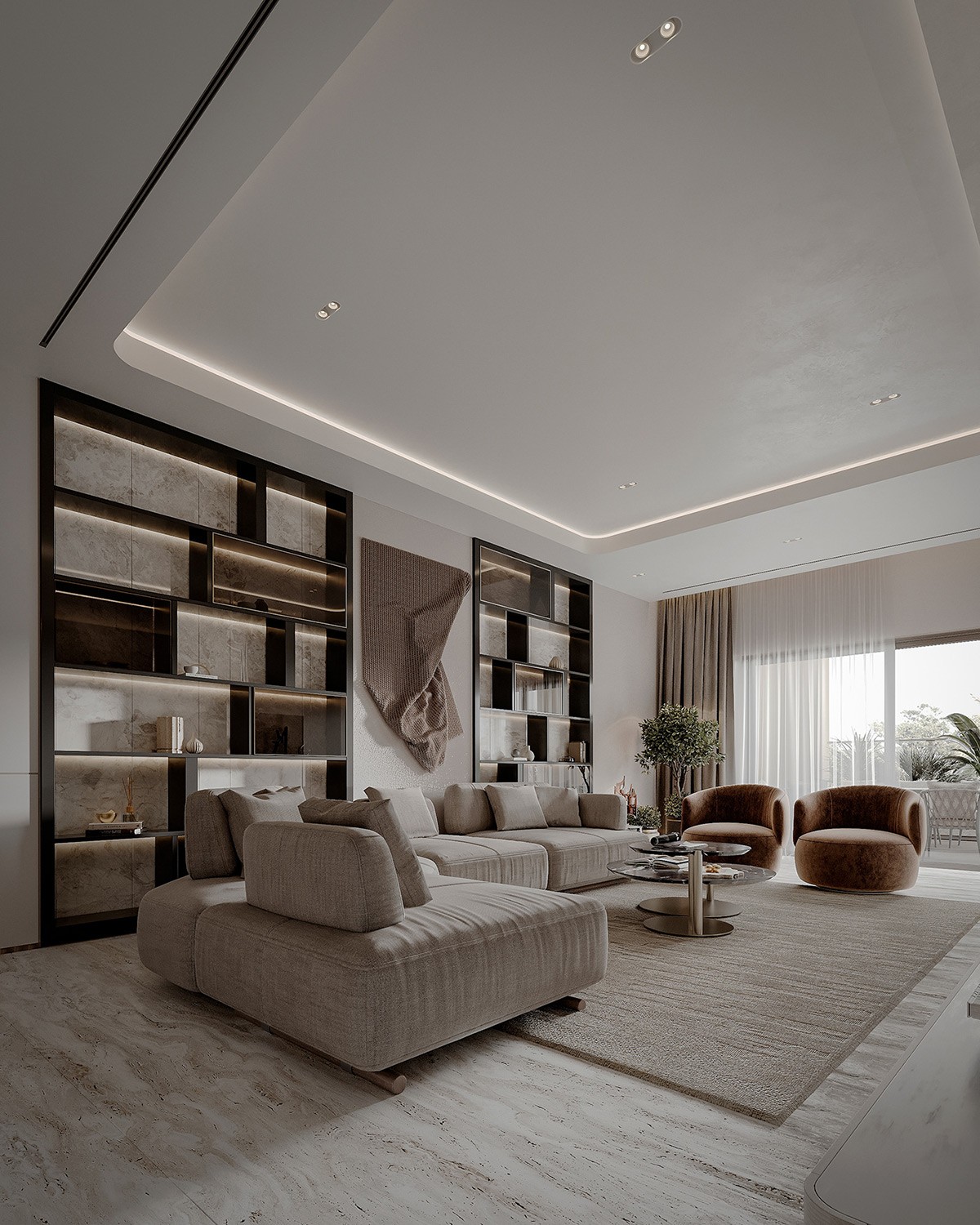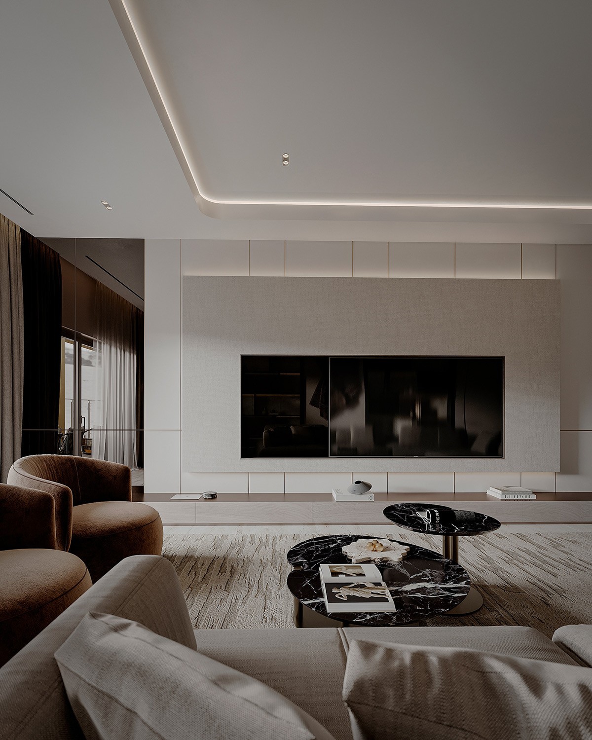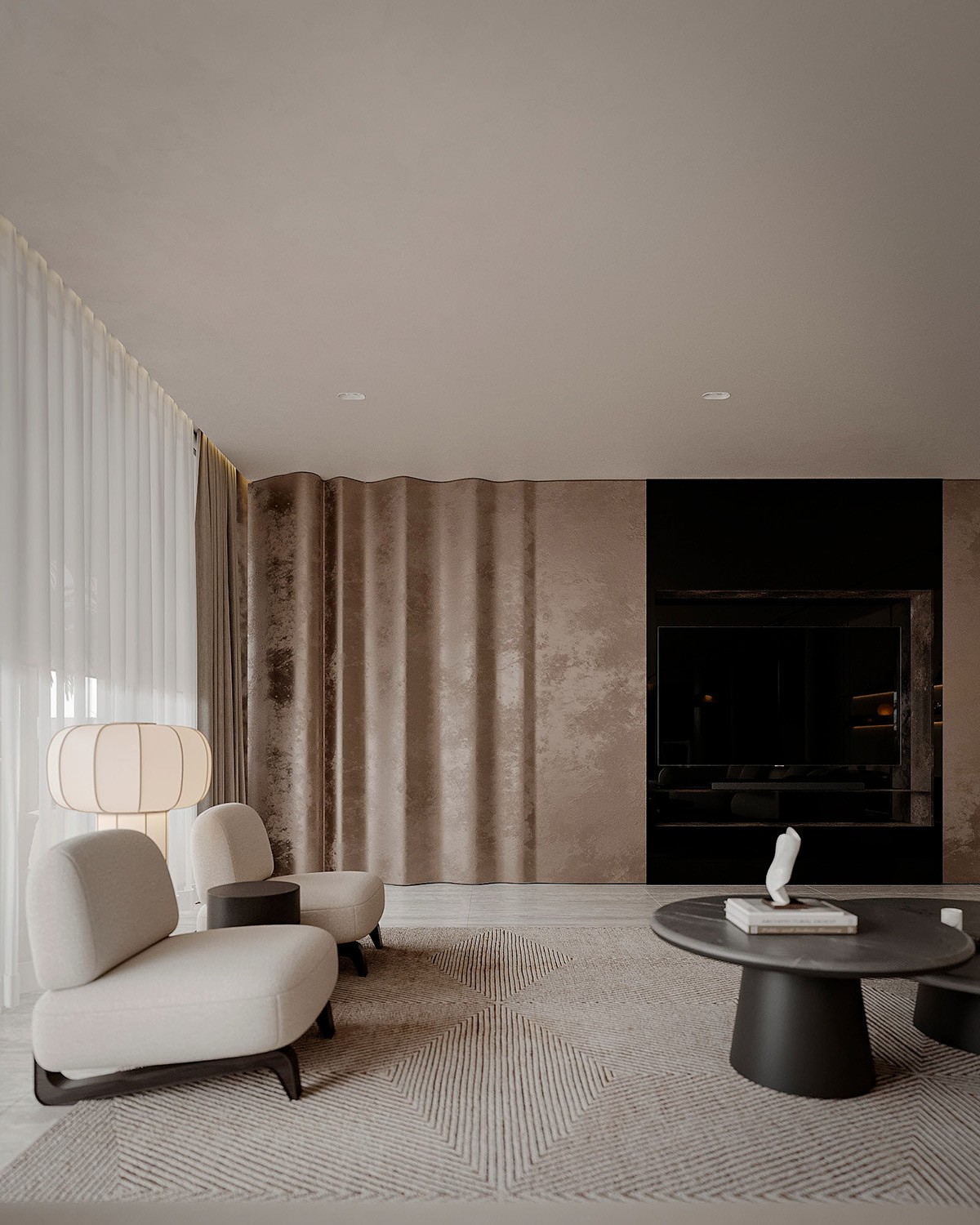 Beige decor radiates an aura of understated elegance and timeless beauty. In the realm of modern living spaces, this versatile hue has garnered tremendous favor for its ability to create a refined and sophisticated ambiance. Using the subtle warmth of soothing neutrality, beige home interiors offer serene settings for relaxation, contemplation, and peaceful family connection. In this article, we invite you to delve into 3 elegant beige living spaces, each expertly visualized by Julia Tkachenko. We’ll look at how dark accents help to anchor a light beige living room scheme, how thoughtful furniture selections boost ordinary spaces into high-end sanctuaries, and how creative lighting installations are truly transformative.