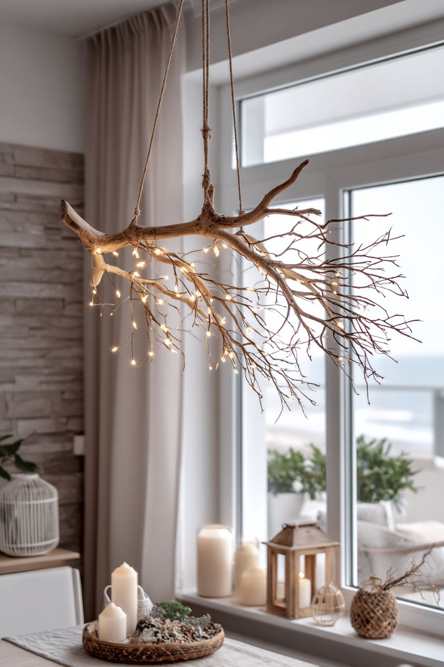 Instead of decorating horizontally, elevate the season vertically. Wall installations, like cascading garlands, floating shelves styled with winter objects, or an alternative “tree” formed using washi tape or wooden dowels, free up floor space while becoming stunning art pieces. These displays invite creativity, whether you lean geometric, organic, or minimal. As a bonus, wall-mounted décor mixes beautifully with gallery walls or architectural features, adding seasonal warmth without disrupting your layout.