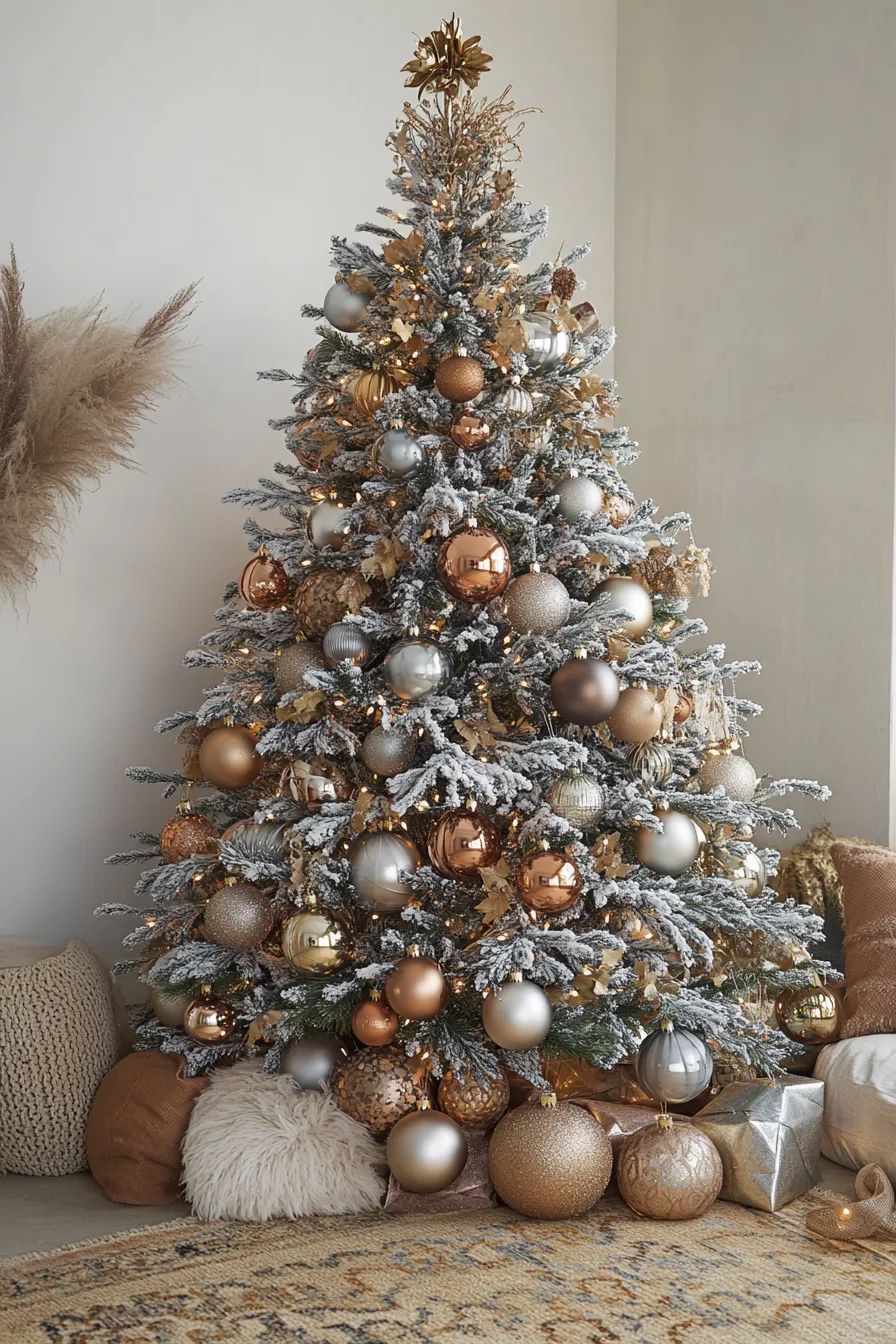 Metallics are timeless, but using them as the main holiday theme, especially in matte or muted finishes, is a distinctly modern approach. Champagne gold, brushed brass, pewter, and rose-gold ornaments or candleholders add glamour without overwhelming your space. You can decorate with metallic garlands, sculptural objects, metallic vases, or shimmery ribbons to create a festive glow. This palette pairs beautifully with neutrals, pastels, or black-and-white décor. It brings luxury and sophistication to the season without leaning on classic Christmas tropes.