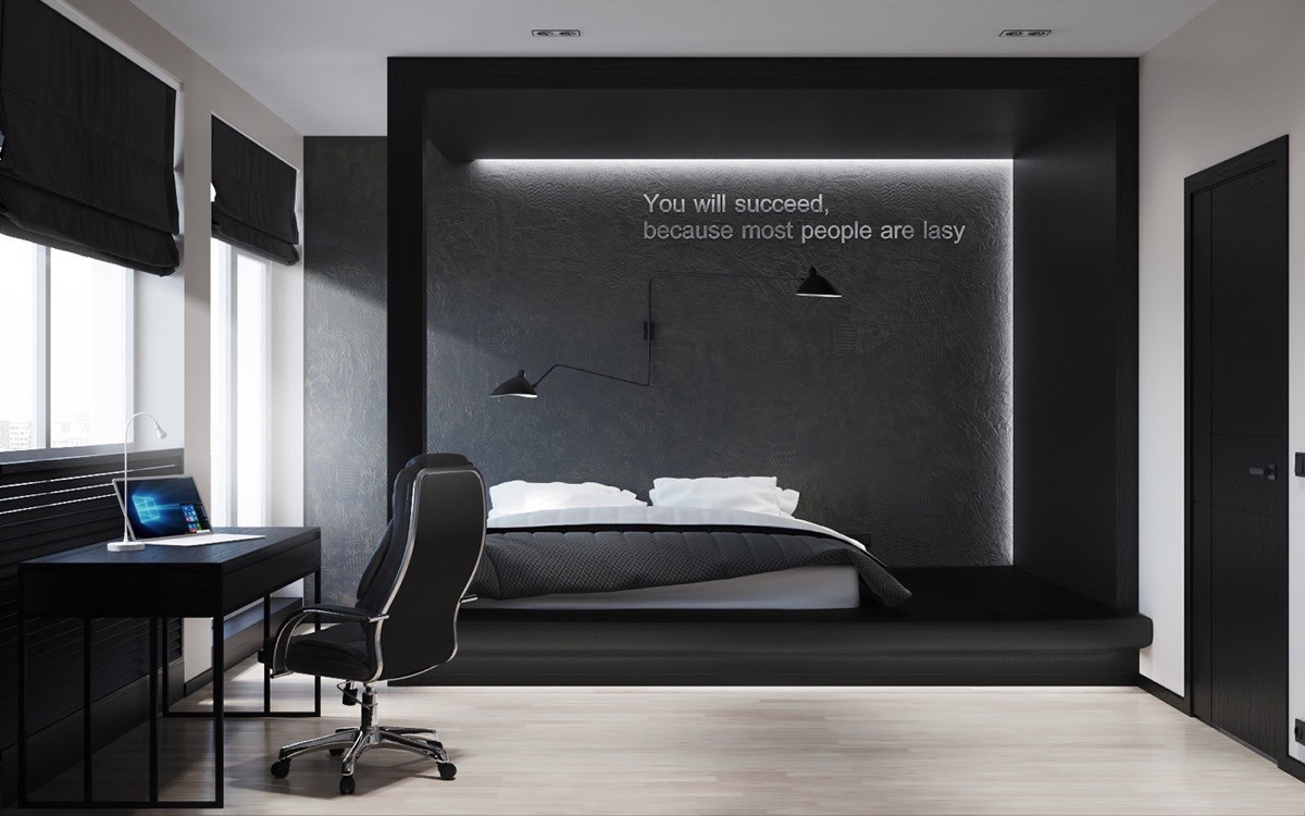 Build a black room, within a white room. A black ‘box’ has been fashioned to house the bed in this predominantly white space. The dark area is uplifted by motivational quotes over the bed, under an illuminated canopy. A huge swing arm wall lamp adds reading light.
