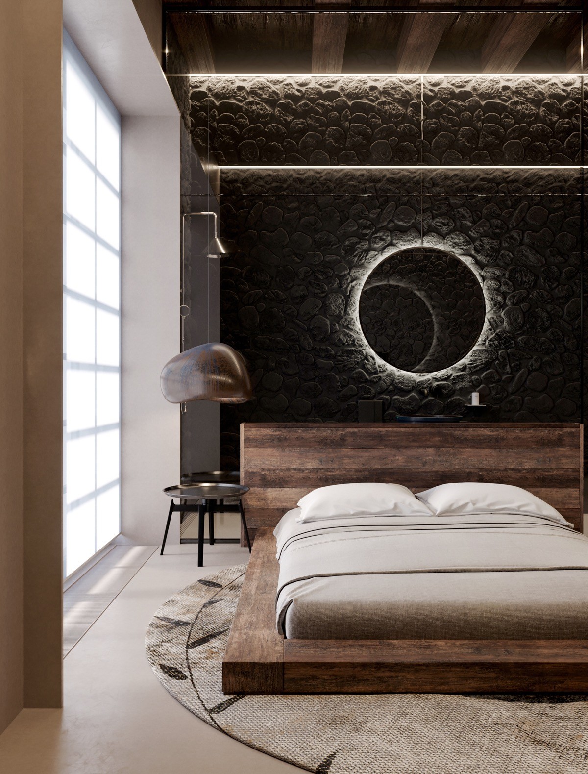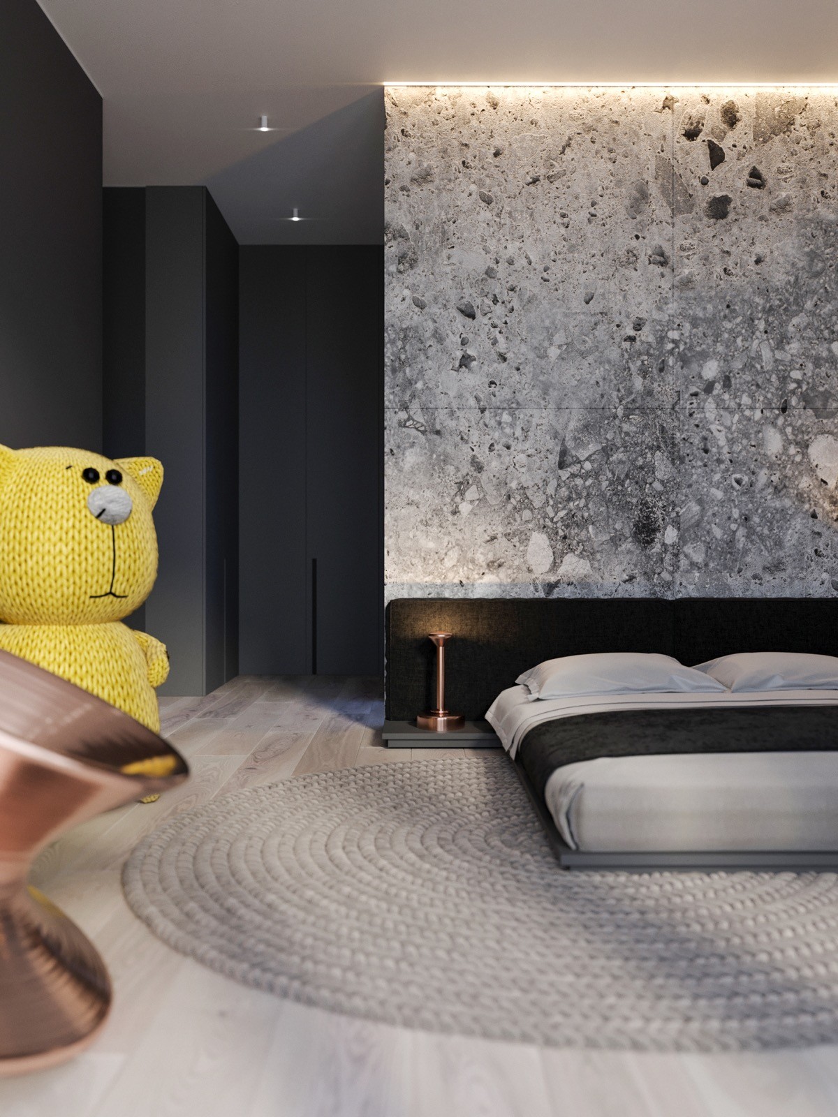 Go black with brickwork. Exposed brick has been painted over in this black and gray bedroom, so that the texture can still be seen. The wall acts as zoning decor for a small bedroom lounge area. The brick texture is complemented by geometric pattern in a niche behind the bed.