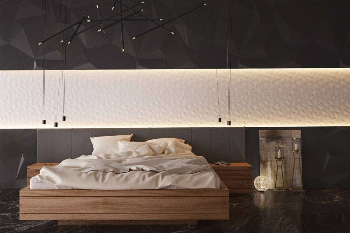 A little splash of white will go a long way. Thin white electrical wires of a modern pendant light scribble luminously across a subtly patterned black wall here. Slender white bedsides trim the baseline.