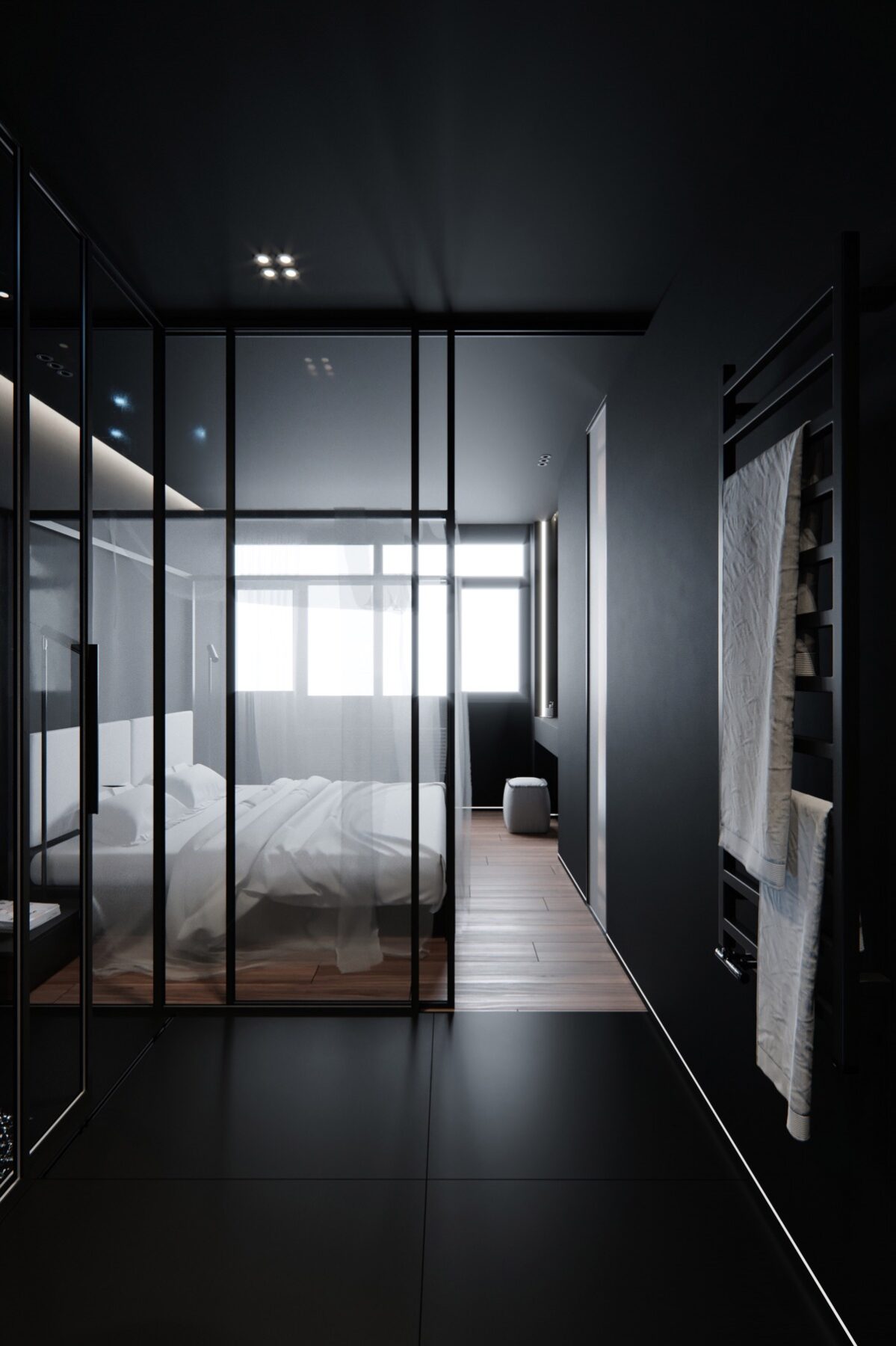 In this example of a glass wall ensuite, the bathroom borrows light from the bedroom rather than vice versa.