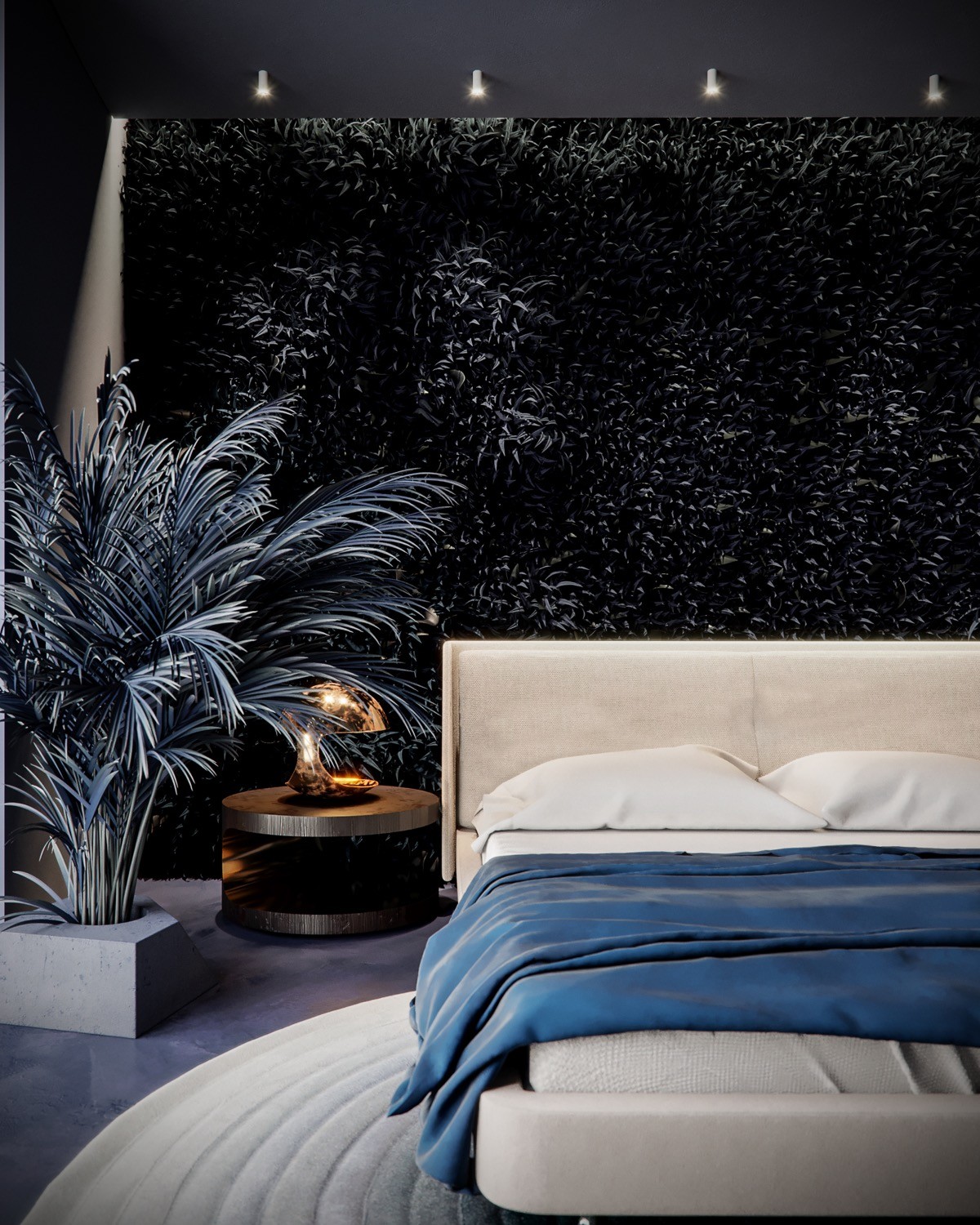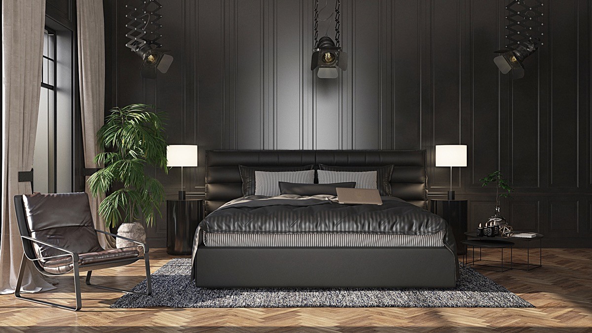 Light it up. If you’re going to have a black bedroom then you have to consider lighting as part of the plan. Install too little illumination and you might find yourself left in the shade. LED strip lights present the perfect solution for edging furniture; attach them along the perimeter of the headboard and around the bed base for a truly inviting and cosy look. Hang a modern chandelier low for extra drama.