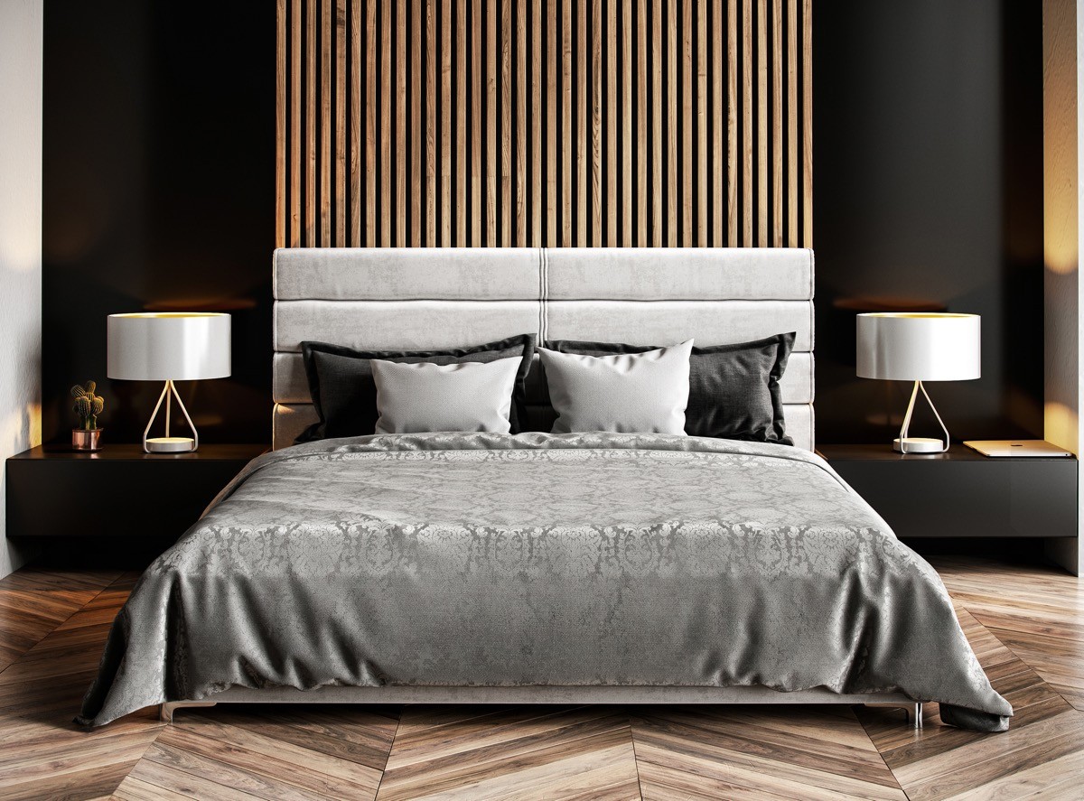 Pierce solid black areas with light accessories. Pale bedside table lamps bring light relief to black bedside sections. See more ideas for wood slat walls here.