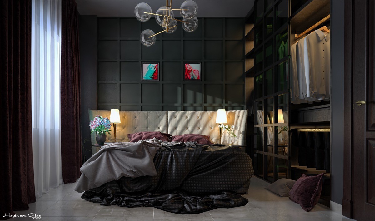 Dark dressed eclectic. This interesting mix of modern and classic pieces are held tightly together by the strong colour scheme. The tufted bed gives off an air of sophistication.