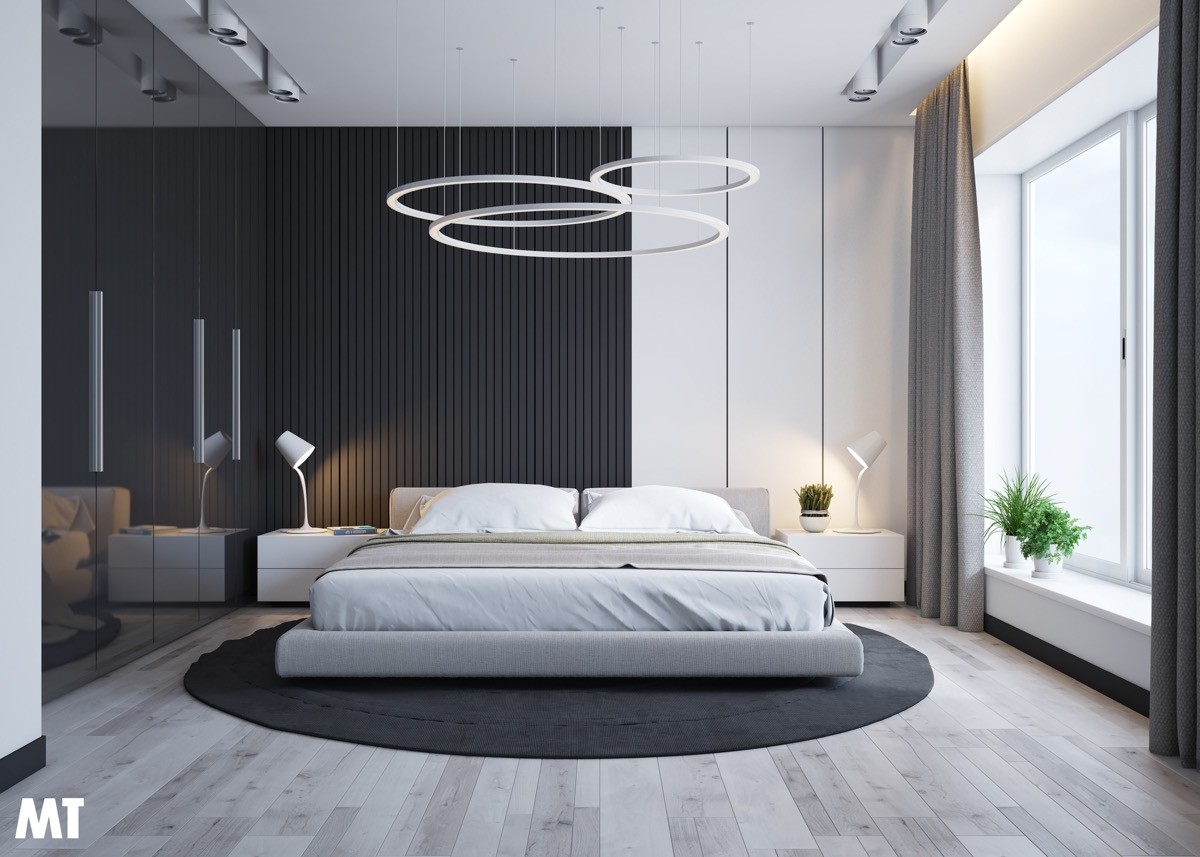 Quietly lighten an all black bedroom with low grey wall panelling and a pale grey rug. A light colored bedroom chandelier can make it stand out against the dark backdrop.