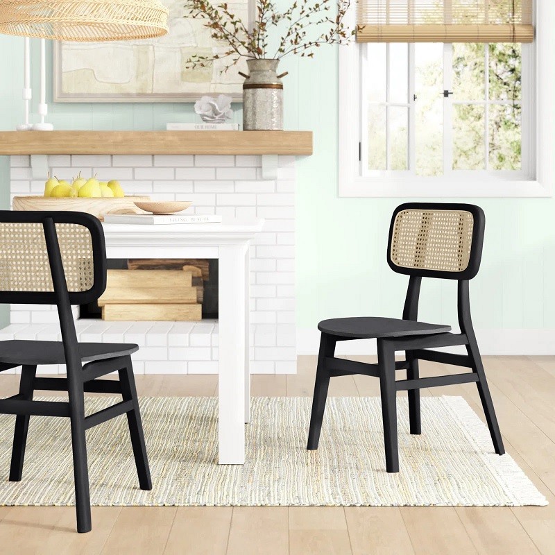 Unique mid-century silhouettes ensure these cane dining chairs will turn heads in any setting. These pieces are available in a range of finishes from bright white to rich black with a handful of natural wood tones in between. Each set includes two fully assembled chairs.