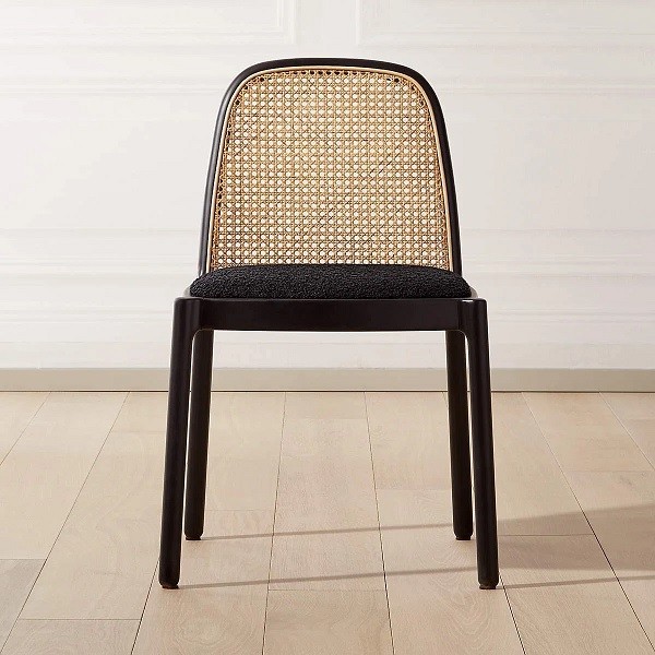 Clean lines make this cane chair especially chic and contemporary, perfect for dining room themes that lean toward minimalism. This piece features cashmere boucle upholstery for a luxurious seating experience, stylish and comfortable all at once. These chairs are stackable for easy storage as needed.