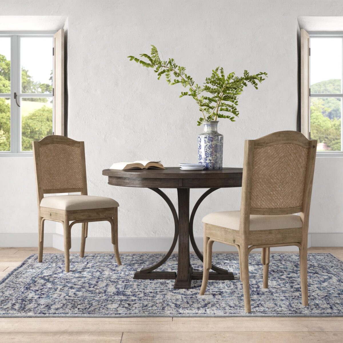 Inspired by the hugely popular French country decor trend, these cane dining chairs feature a Louis-style silhouette softened by distressed finishes for a vintage look. Each chair captures the eye with carved details. Plush padding and smooth upholstery ensure comfort for long dinners with loved ones.