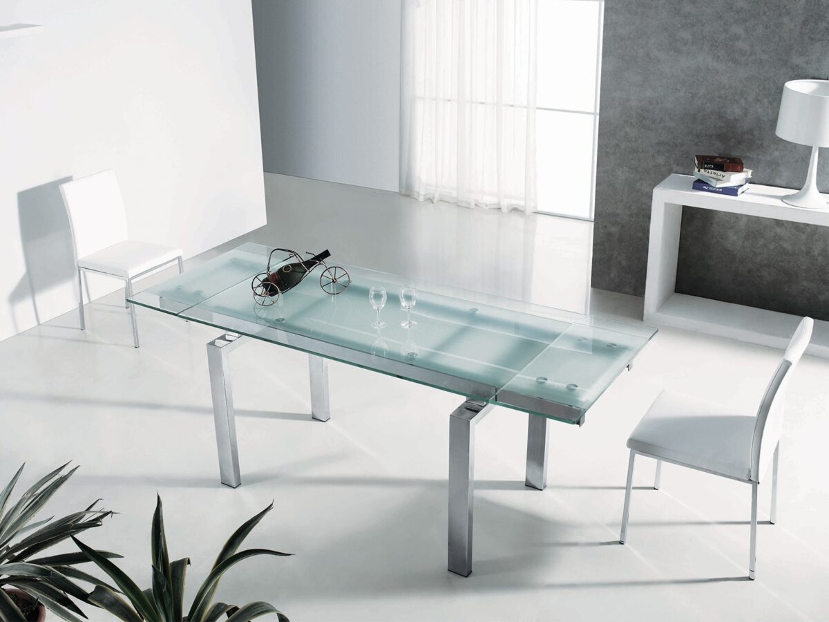 This extendable dining table works to partially obscure the inner workings with attractive frosted glass. The legs are finished in chrome for sharp contemporary appeal.