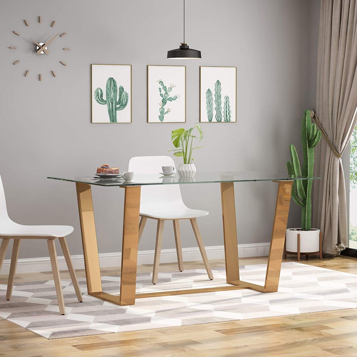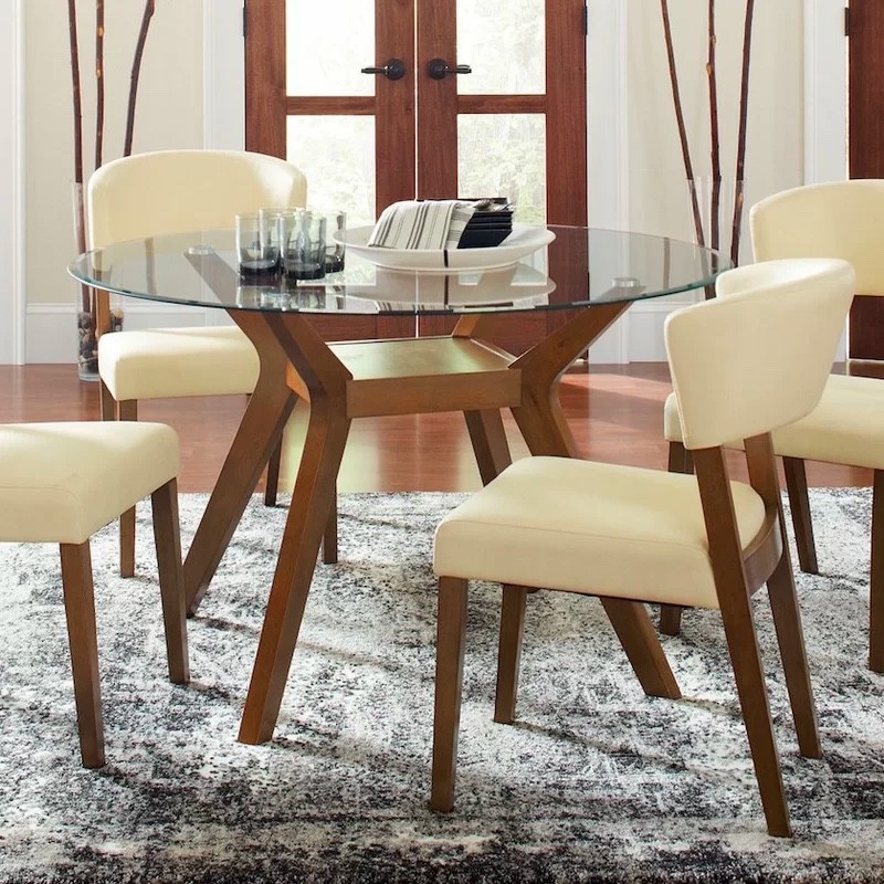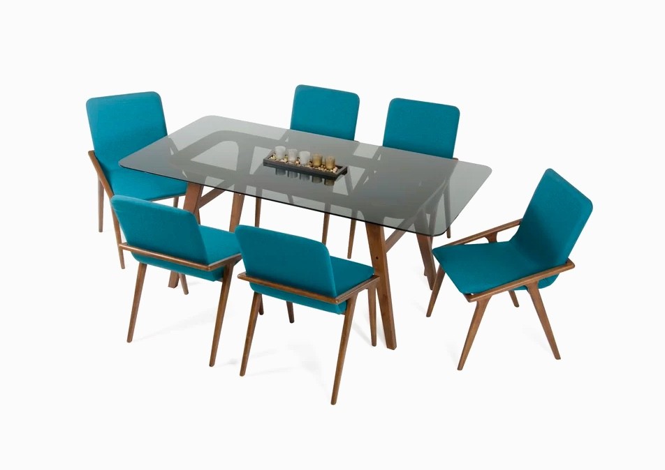 Here is another dining table with mid-century modern flair, this time large enough to seat six. The glass tabletop enjoys rounded corners – a feature that not only looks stylish, but also appeals to families with younger children.