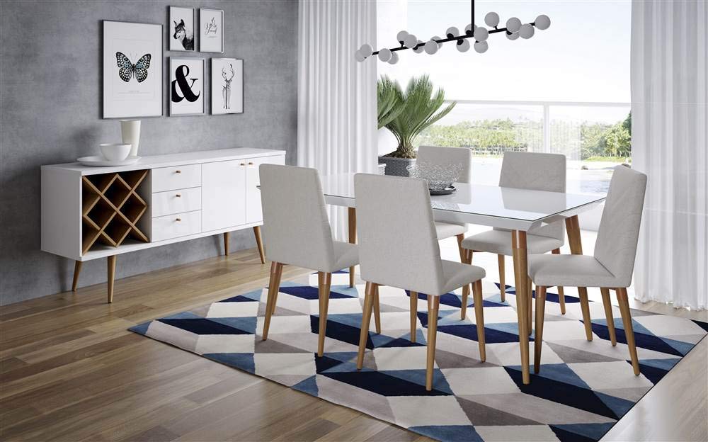 Mid-century modern inspiration meets sleek contemporary styling with this exceptionally versatile dining set. Choose from two finish combinations – the tabletop is available in glossy white or elegant marble, with the chair upholstery available in beige or grey. Each set includes six chairs.