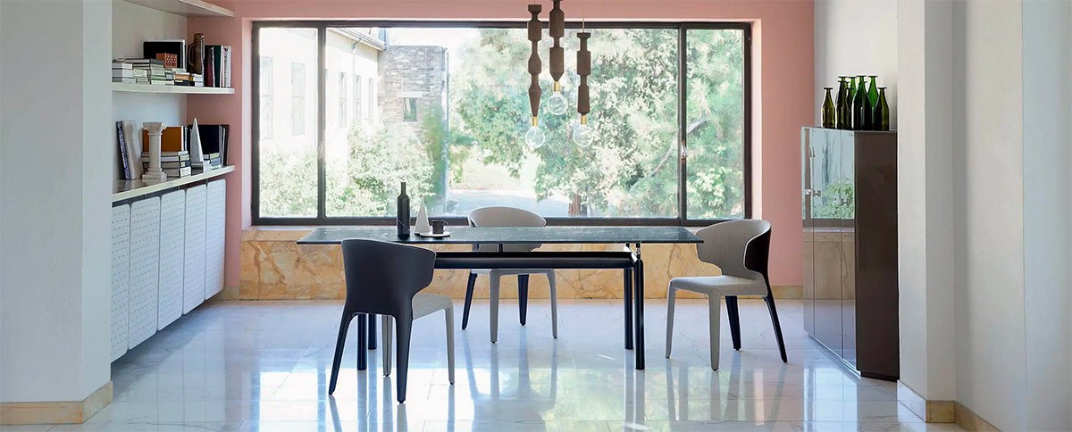 Designed by Luciano Bertoncini in 2011, this dining table has become a mainstay of high-end minimalist dining room design. The clean lines, calm white finish, and beautiful proportions keep the emphasis on the act of communal dining – but those who take a closer look will find apparent quality worth a second glance. The frosted glass tabletop adds a touch of depth and dimension over the plain powder coat version.
