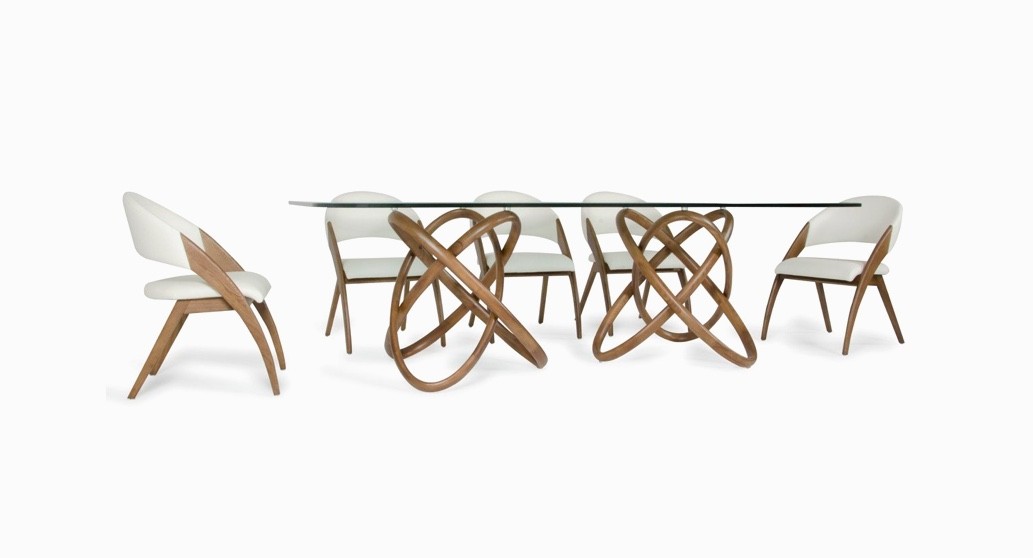 Behind the simplicity of this dining set is an exciting drama of angles and curves. The tilt of the backrest, the taper of the table legs – every detail is refined. This set comes with four handsome chairs upholstered in creamy white faux leather over plush supportive padding.