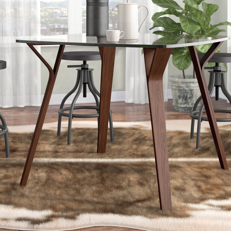 Clean mid-century modern style makes this dining table stand apart from the rest. The smooth tapered legs flare out toward the top, the thick glass tabletop featuring graceful subtle curves. This square dining table maintains a compact footprint ideal for eat-in kitchens and dining nooks.