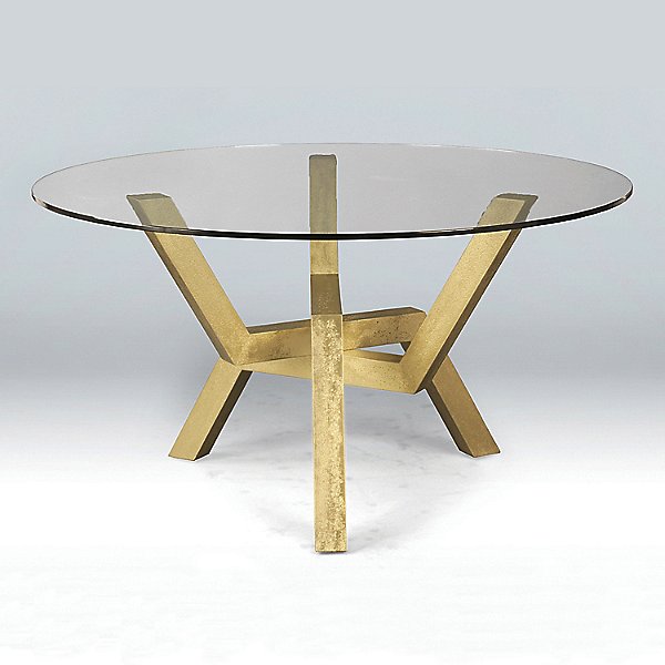 The lovely Cleo dining table by Peter Saloom is a flexible design with an array of customizable options. Start with size – this table is available with a diameter of 48”, 54”, or 60” to accommodate small and large dining rooms alike. The range of finishes is robust as well, ranging from warm wood tones to eye-catching delights like the hammered gold pictured here.