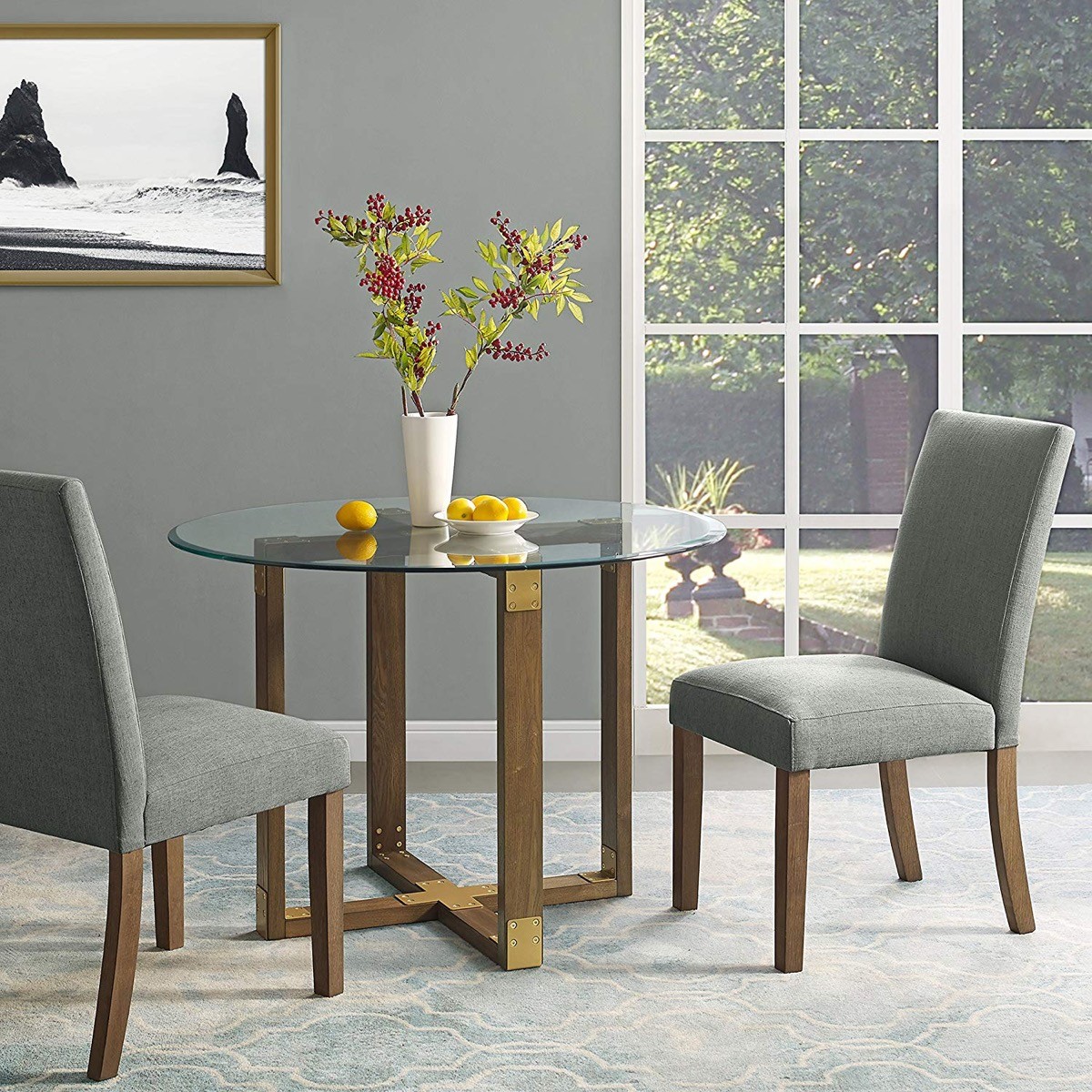 Warm and minimalist – this dining set keeps things simple with its metal legs finished to look like solid walnut, its simple rectangular glass top, and smooth curvaceous chairs. The sleek neutrality of this set ensures easy coordination with your existing decor and tableware.