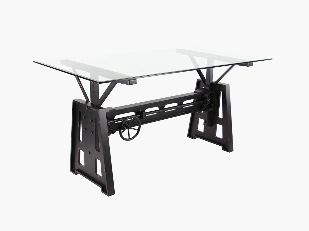 For a more playful take on industrial aesthetics, this rectangular dining table immediately catches the eye with its mechanical workshop-style base. The base is constructed from sturdy wood and metal, accented with authentic-looking details like a stationary crank wheel. Use to complement industrial, rustic, and modern interior themes.