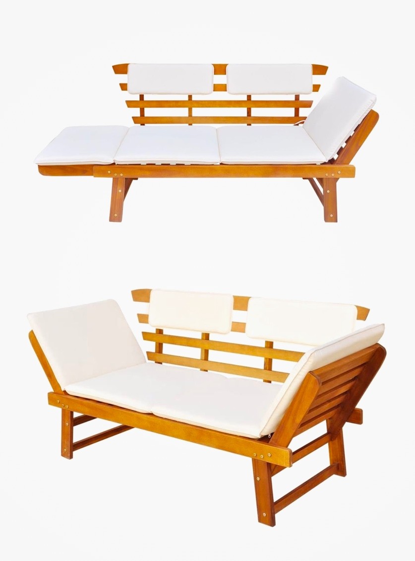 Transformers, lounge chairs in disguise! From lounge chair to daybed to comfortable bench and back again, this option is highly versatile—to say the least. Made from weather-resistant and durable Acacia wood.