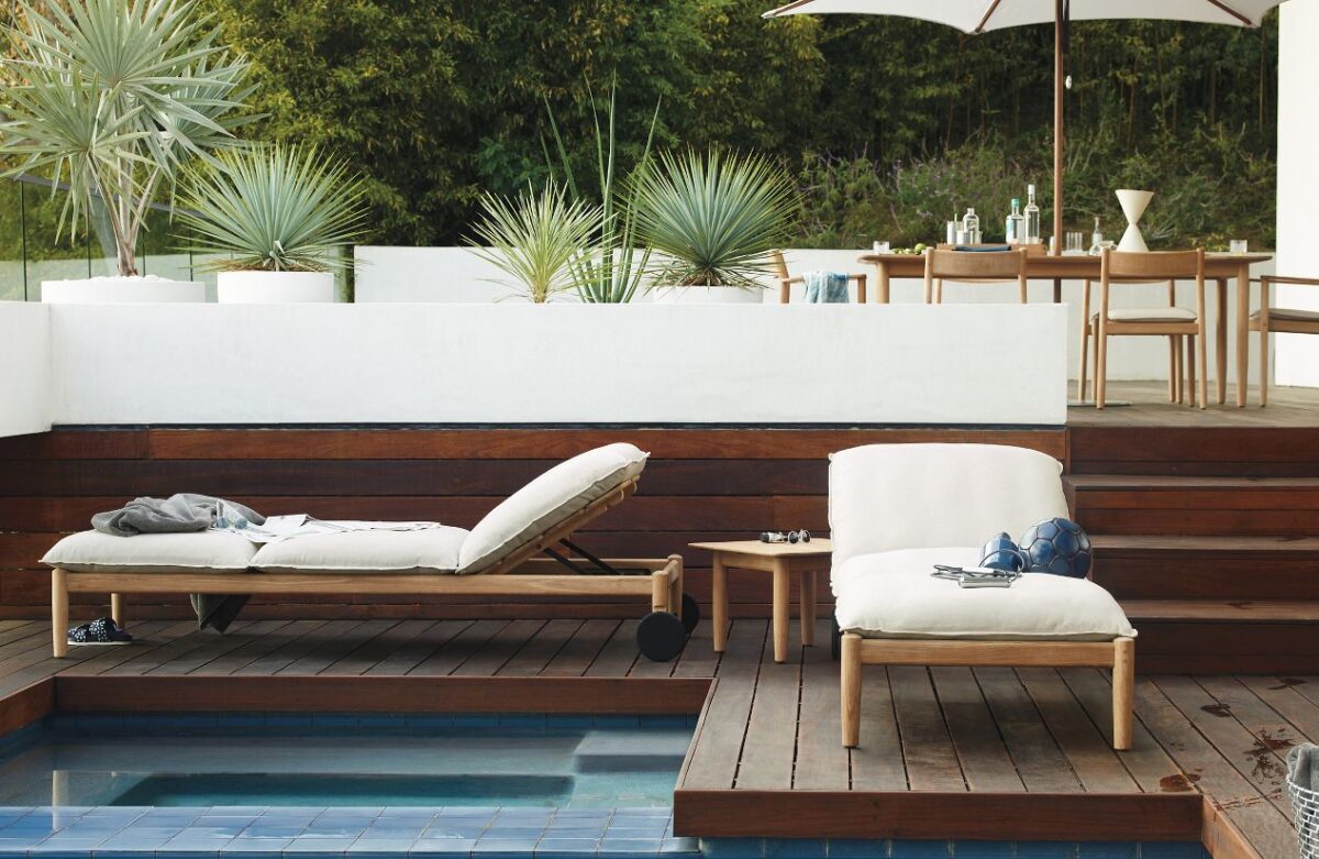 This modern teak chaise lounge will cradle your body low to the ground. Want a lift? A stainless steel support is also available to raise this design closer to the height of a traditional lounger.