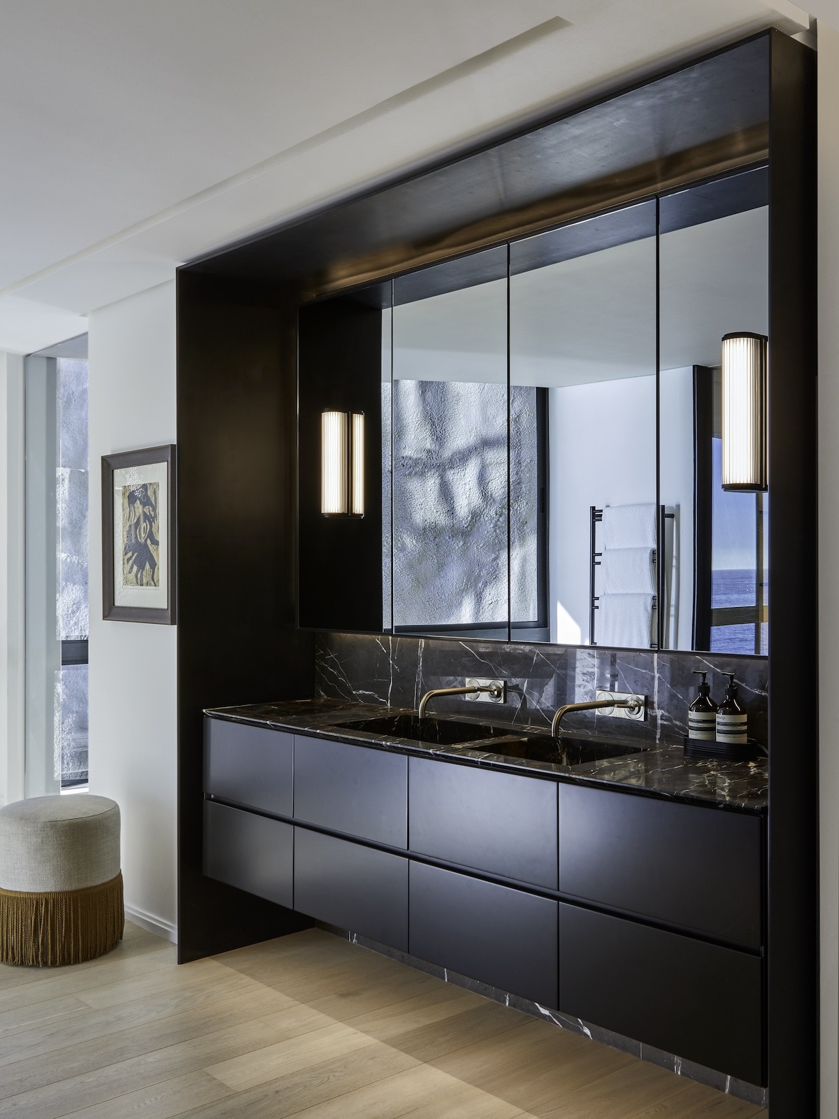 A black marble countertop, black inset bathroom basins, and a black double vanity unit build a color-blocked focal point. Wall-mounted bathroom faucets and a pair of modern wall sconces create bright punctuations.