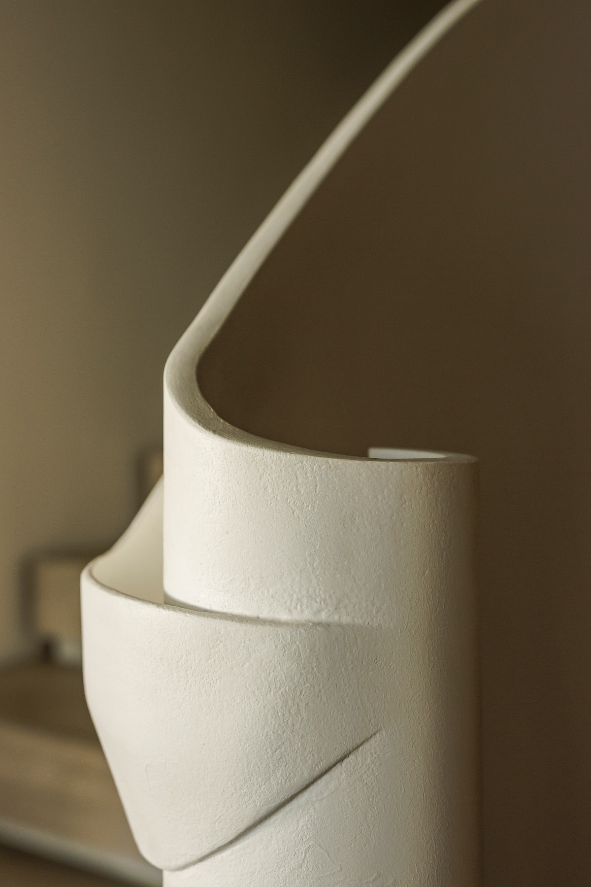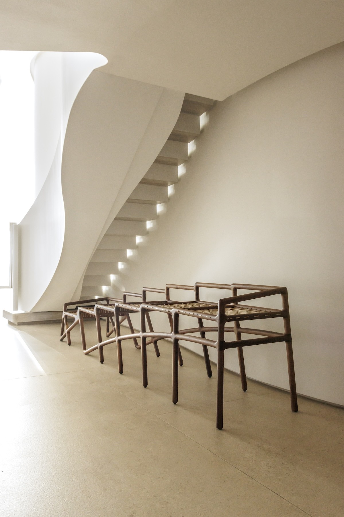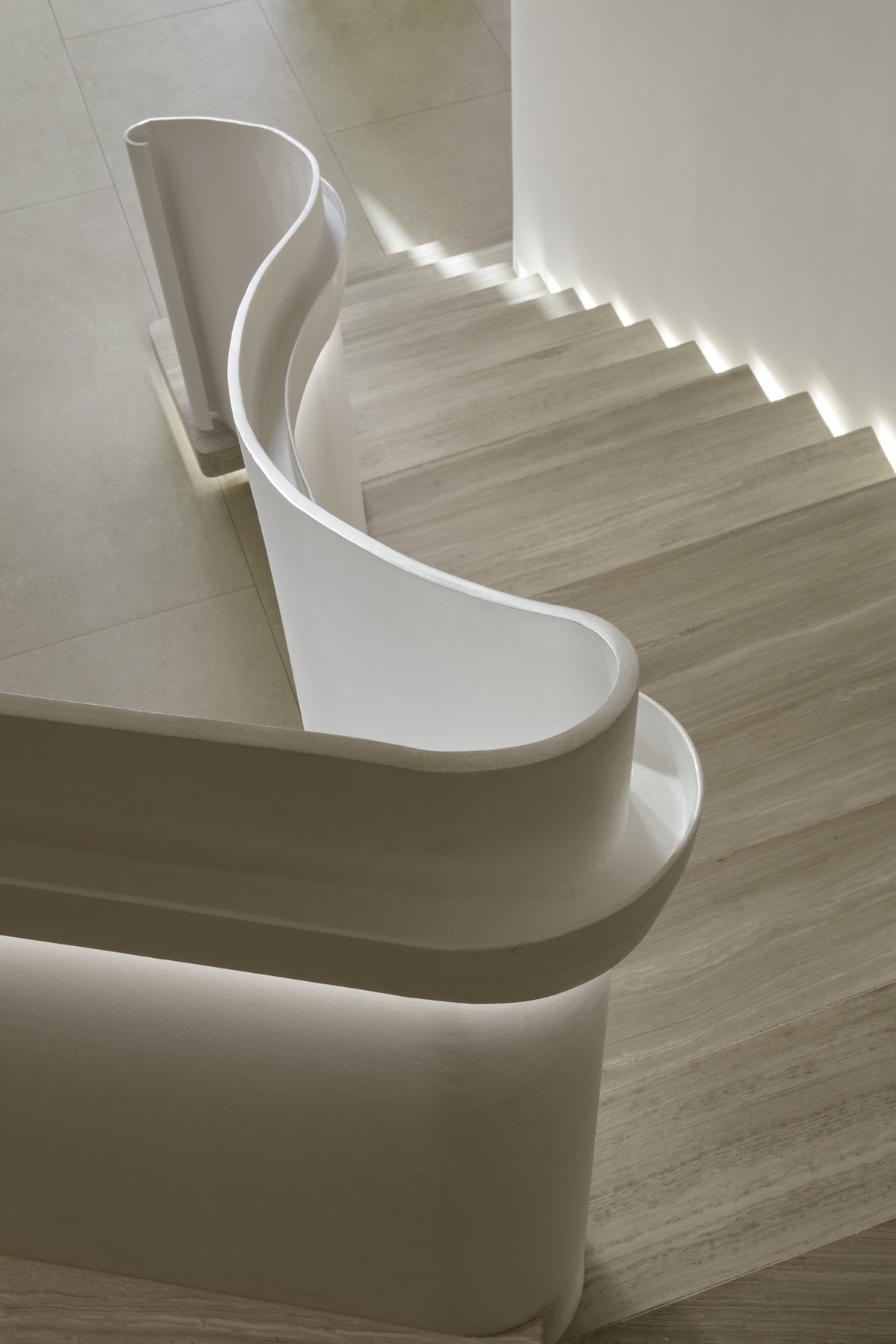 A curvaceous staircase connects the entrance and impressive living space. The unique staircase design was inspired by mountain contours and so infuses the interior with a natural spirit. The organic lines of its pale, opaque balustrades carve out a liquid-like flow.
