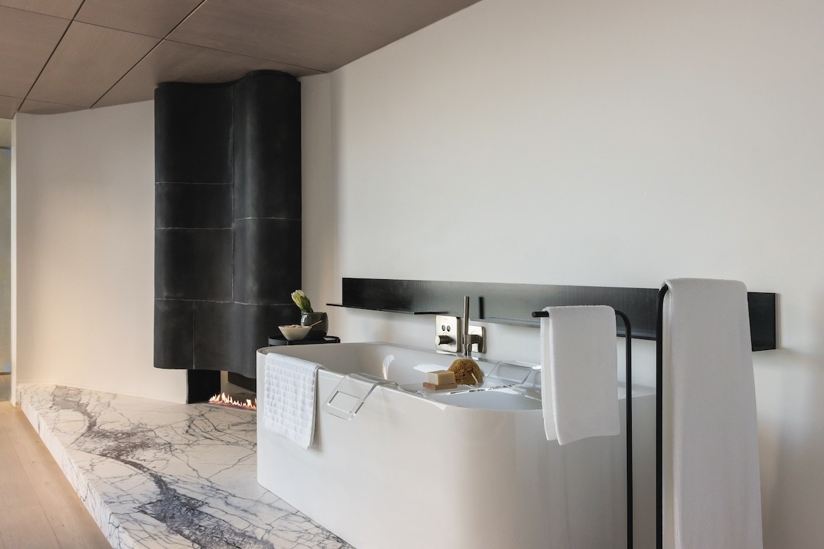 The master bathroom has a side perspective of the ocean. An open, biofuel fireplace burns with a magical flicker when the lights are lowered for a relaxing soak in the modern freestanding bathtub. A white marble platform elevates the look.