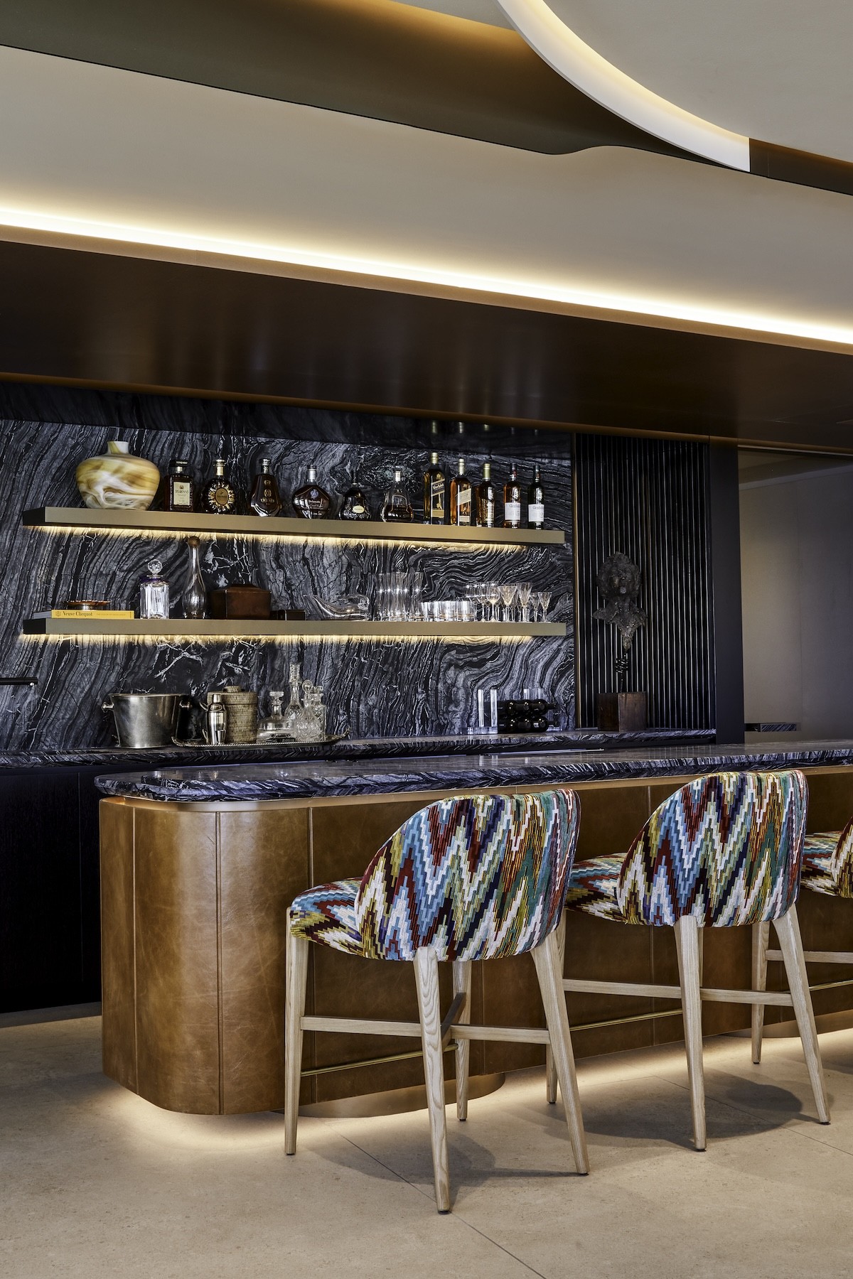 The curved silhouette of the hand-chiseled bar ties in with the undulating perimeter of the home. Black and white marble countertops and a matching backsplash amplify a feeling of luxury. Three colorful bar stools give the space a playful character, setting the scene for fun. Above the home bar, the ceiling adds a sculptural essence with its curves, and harbors concealed LED light strips.