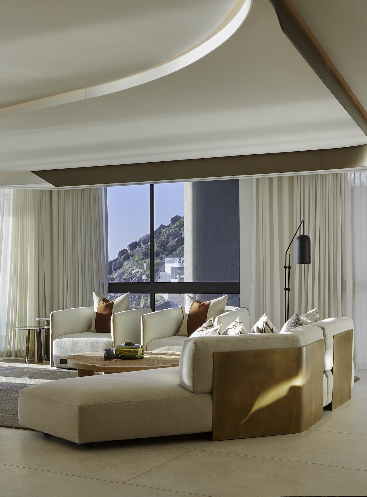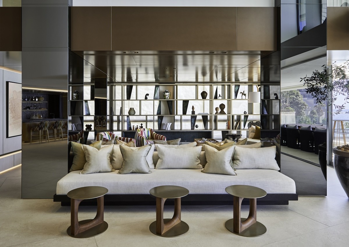 Bulky, structural columns were disguised behind smoked mirrors. Because of this reflective material choice, the ocean view is brought rippling through the interior, and the lighting scheme glows twice as bright. A comfy white sofa fits snugly between the columns, bidding friends to stay a while. Three accent tables march in front.