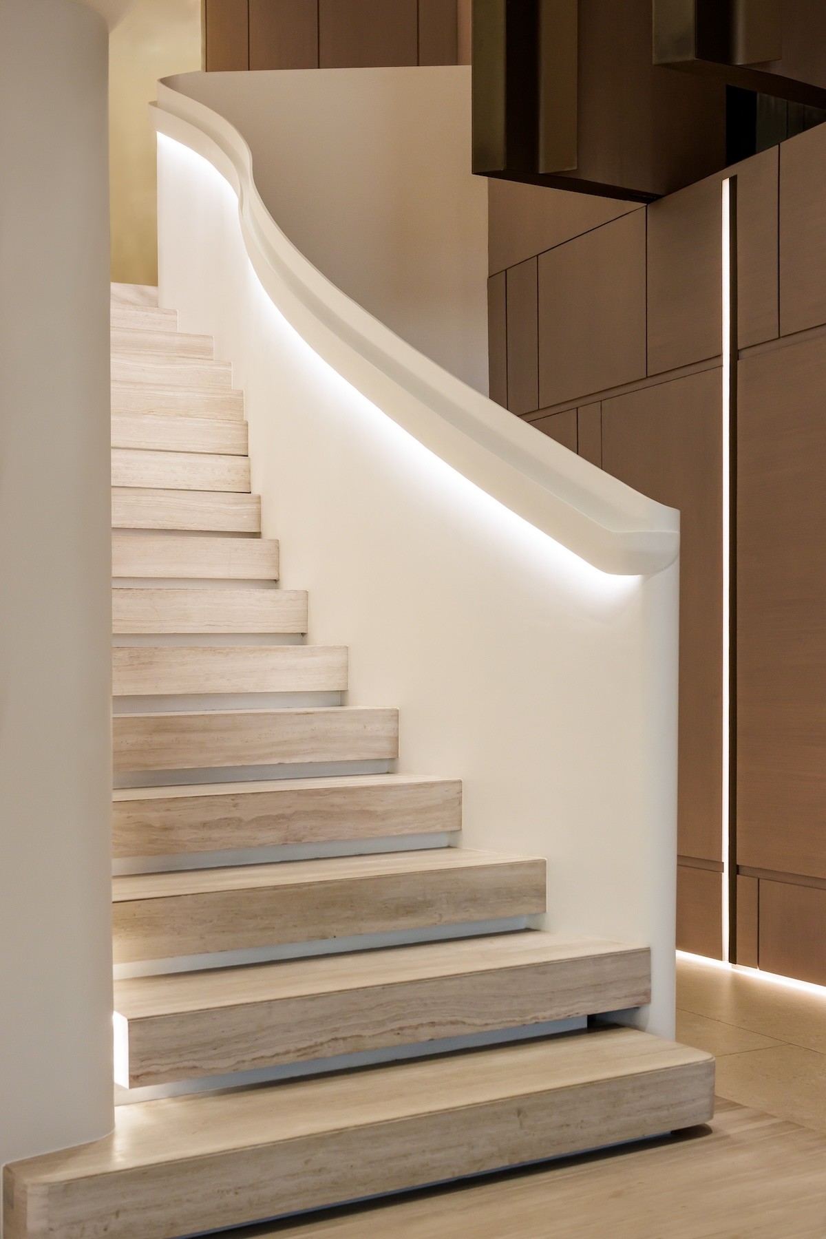An LED ribbon illuminates the underside of the banister, throwing an inviting glow on the smooth wooden steps of the staircase. The wooden treads protrude beyond their risers, giving each one a lightweight, floating effect. Large format tiles clad the flanking wall of the hallway, accentuating the scale of the entryway.