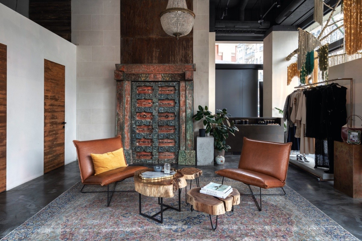 One man’s trash is another man’s treasure. These carpets and chandeliers were bought in vintage markets in Paris. The decorative carved door came from India. Brown leather chairs complement the vintage vibe.