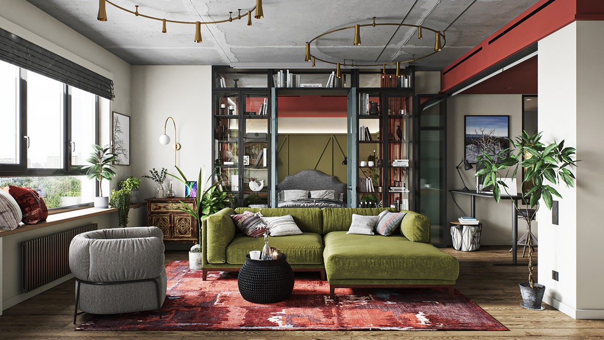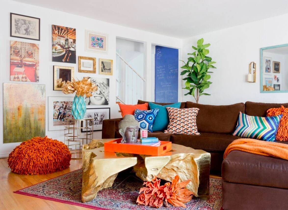 Modern eclectic. Counteract bright eclectic accessories with a dark backdrop.