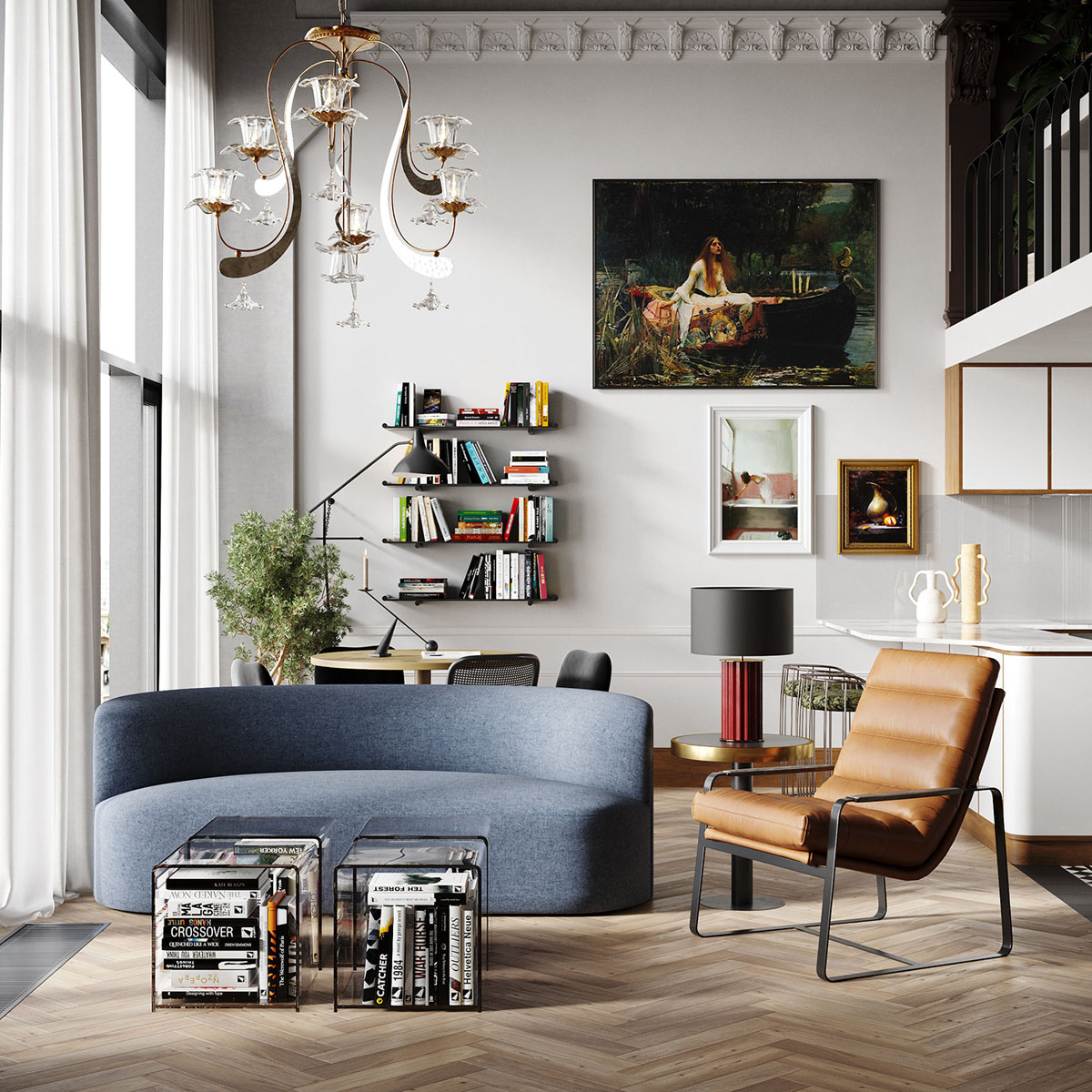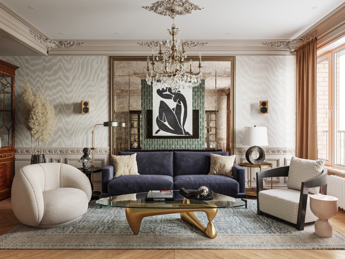 Minimalist eclectic. Take out the rug and the excess accent furniture to style a more minimalist eclectic aesthetic. This one makes up for the reduction of smaller things with a large living room chandelier.