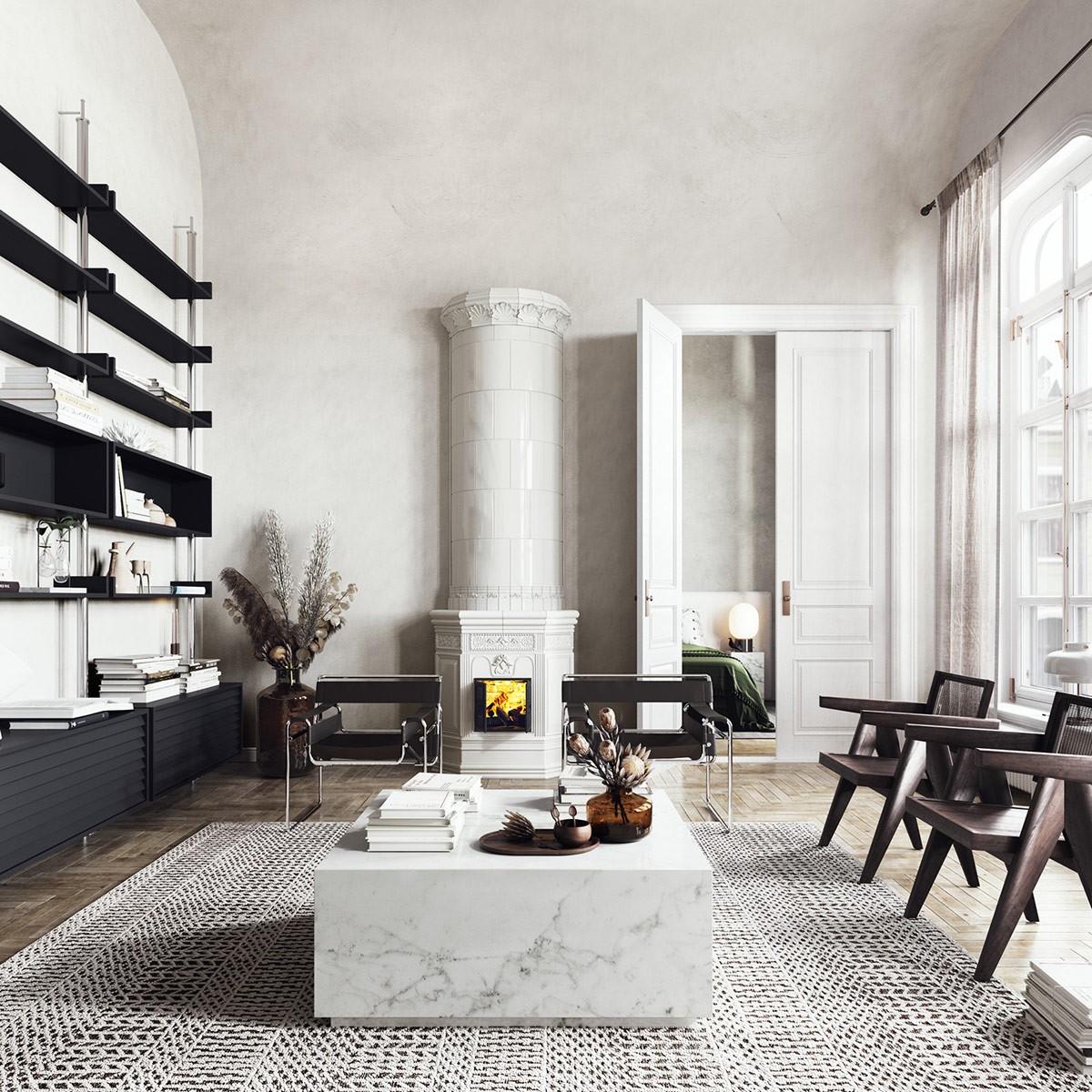 Black and white based eclectic decor. Turn down the noise with monochrome eclectic decor, sophisticated silhouettes, and a chic white marble coffee table.