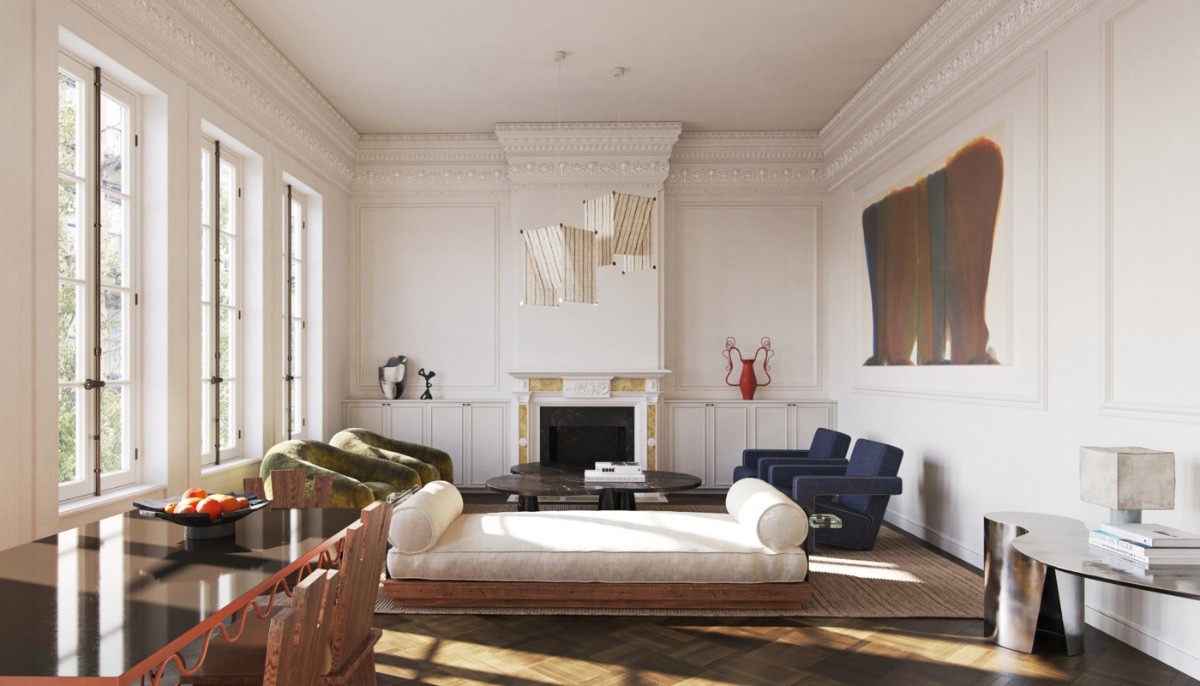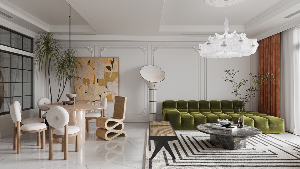 Sculptural moments. Art comes in many forms, including in the furniture itself. Choose sculptural chairs and a sofa with a playful silhouette to build character into the room.
