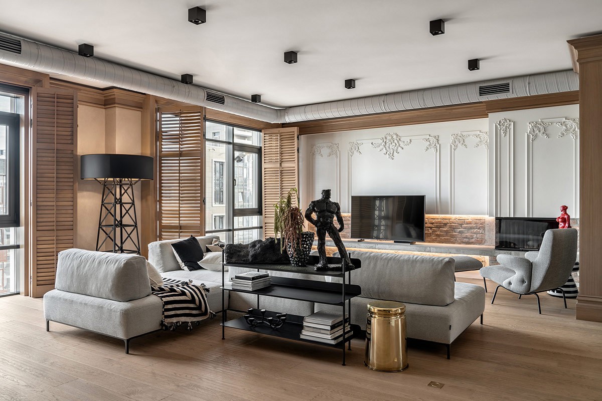 A slice of neoclassical elegance. Neoclassical eclecticism is achieved with elements of decorative boiserie, crown molding, and elegant arches. Here, boiserie panels are sliced through to fashion a modern edge.