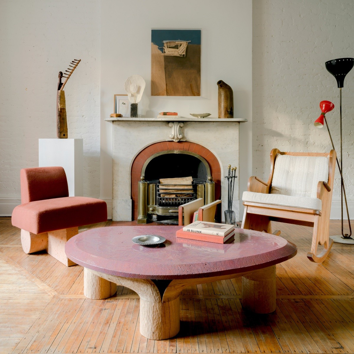 Every piece makes a statement. Just three pieces make up this small lounge area, and each has a standout aesthetic. From the chunky coffee table and quirky lounge chair to the inviting rocking chair, all exude individual character.