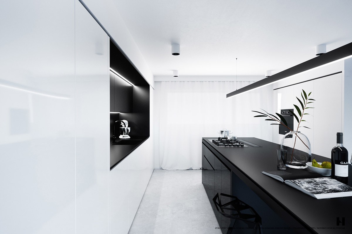 Trick the eye with high contrast. The larder units in this black and white kitchen go almost unnoticed. All the attention is drawn away from the slab fronted white cabinets by the unrelenting black base units and countertop combo opposite.