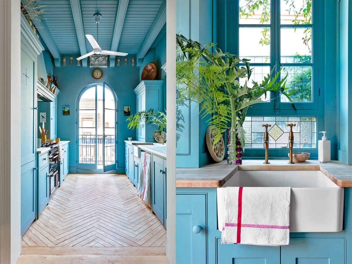 Go all out on a colour theme. This blue kitchen has the same shade of blue units, walls and ceiling.