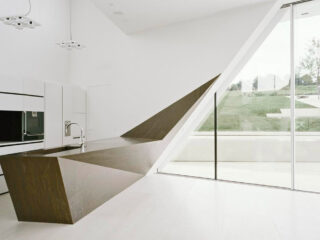 Think outside the box. This slanted futuristic kitchen bench skims straight over a slope in the floor.
