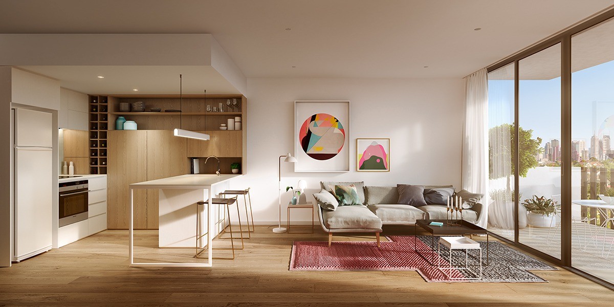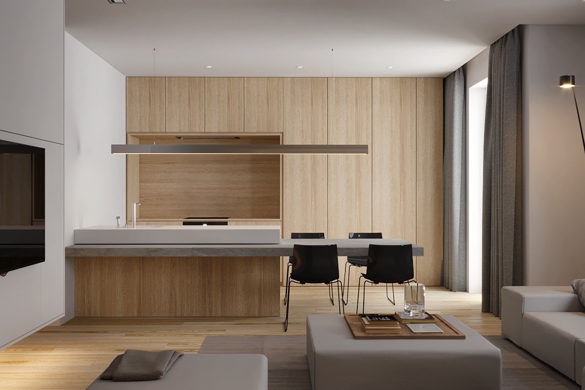 Screen off the mess. Fashion a partially dividing wall that climbs just a little higher than the back of your units in an open plan layout. The added height is just enough to screen off unavoidable cooking mess and dishes from the rest of the living room. Attach a narrow countertop on the divider to create a neat coffee bar, and finish with a few bar stools.