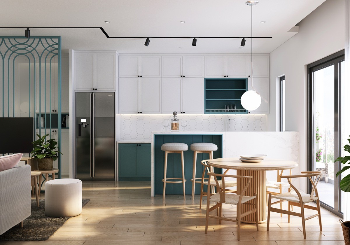 Use coloured accents to highlight key areas, like a breakfast bar or plate rack.