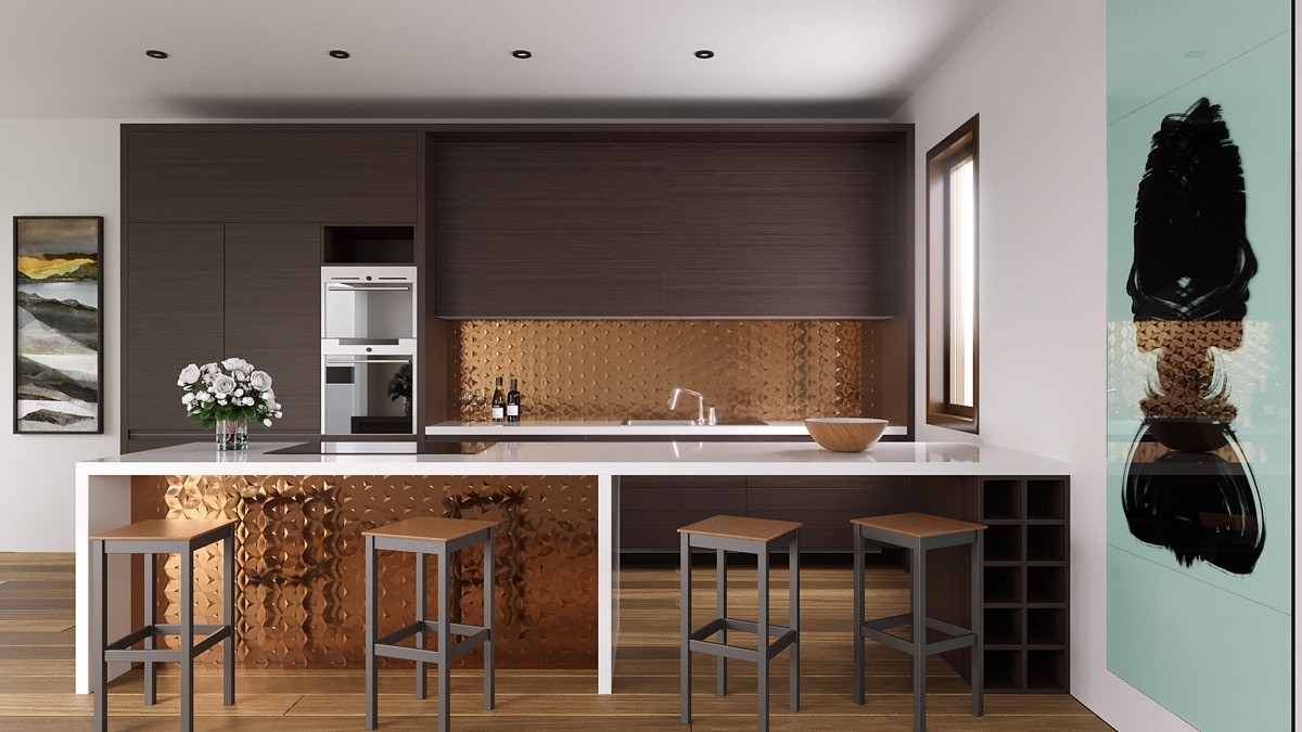 Look high and low. Copper panels tie the two sides of this design together, with the copper at the back situated higher to keep it visible to the rest of the living room.