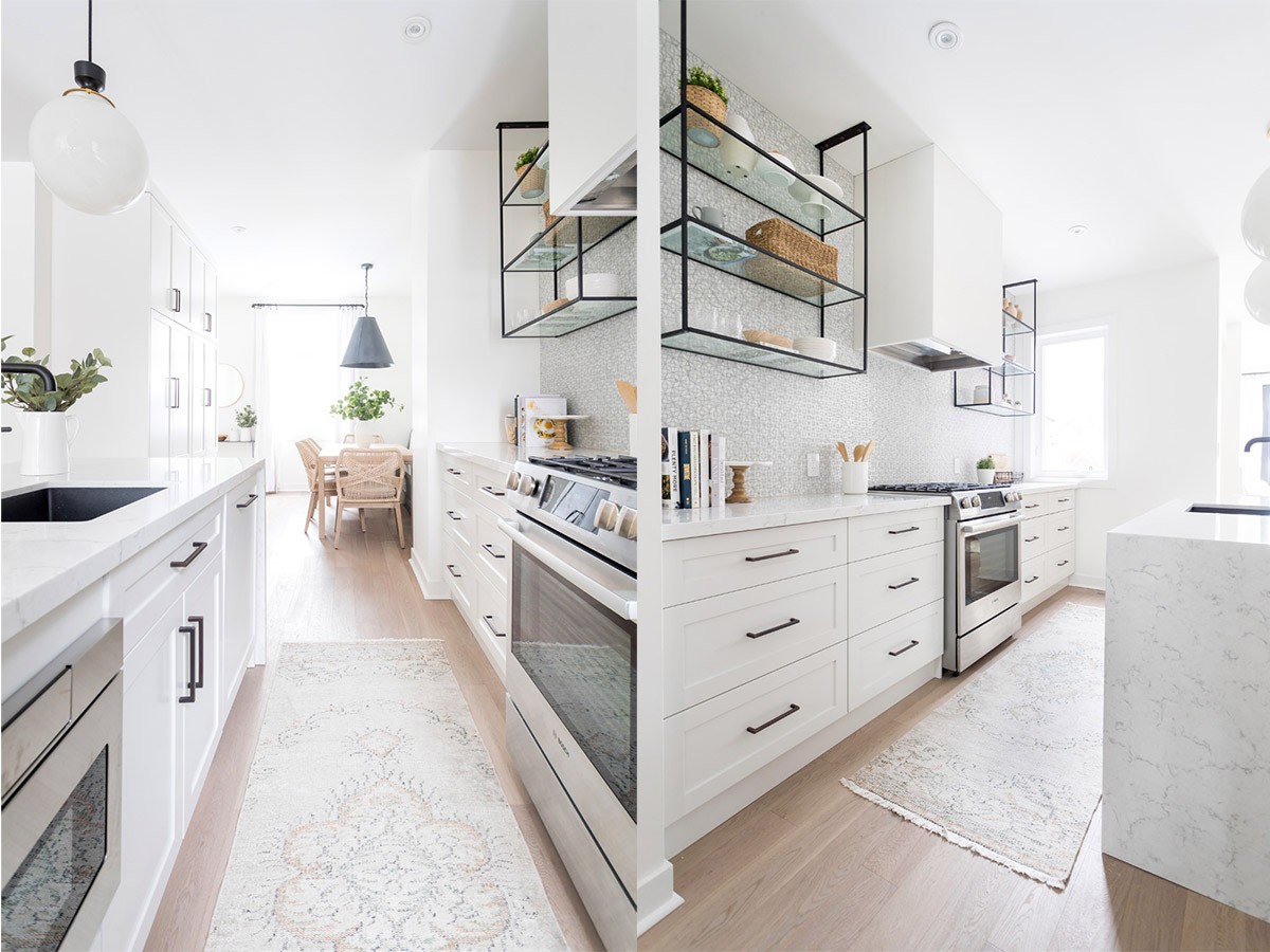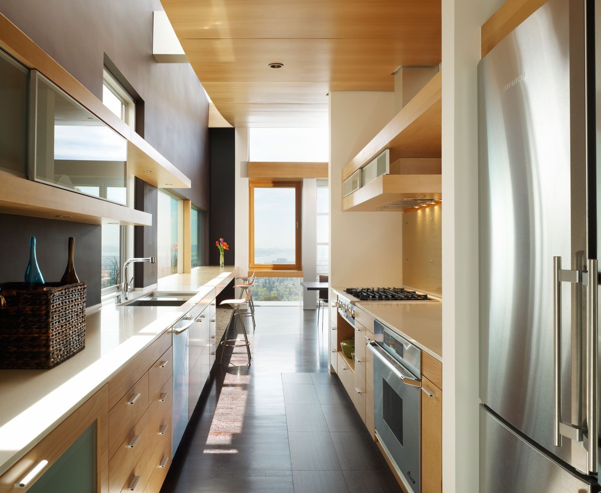 Make a galley kitchen feel wider by installing the wall cabinets only on one side. An open shelf can provide extra storage on the opposite wall without closing up the space.