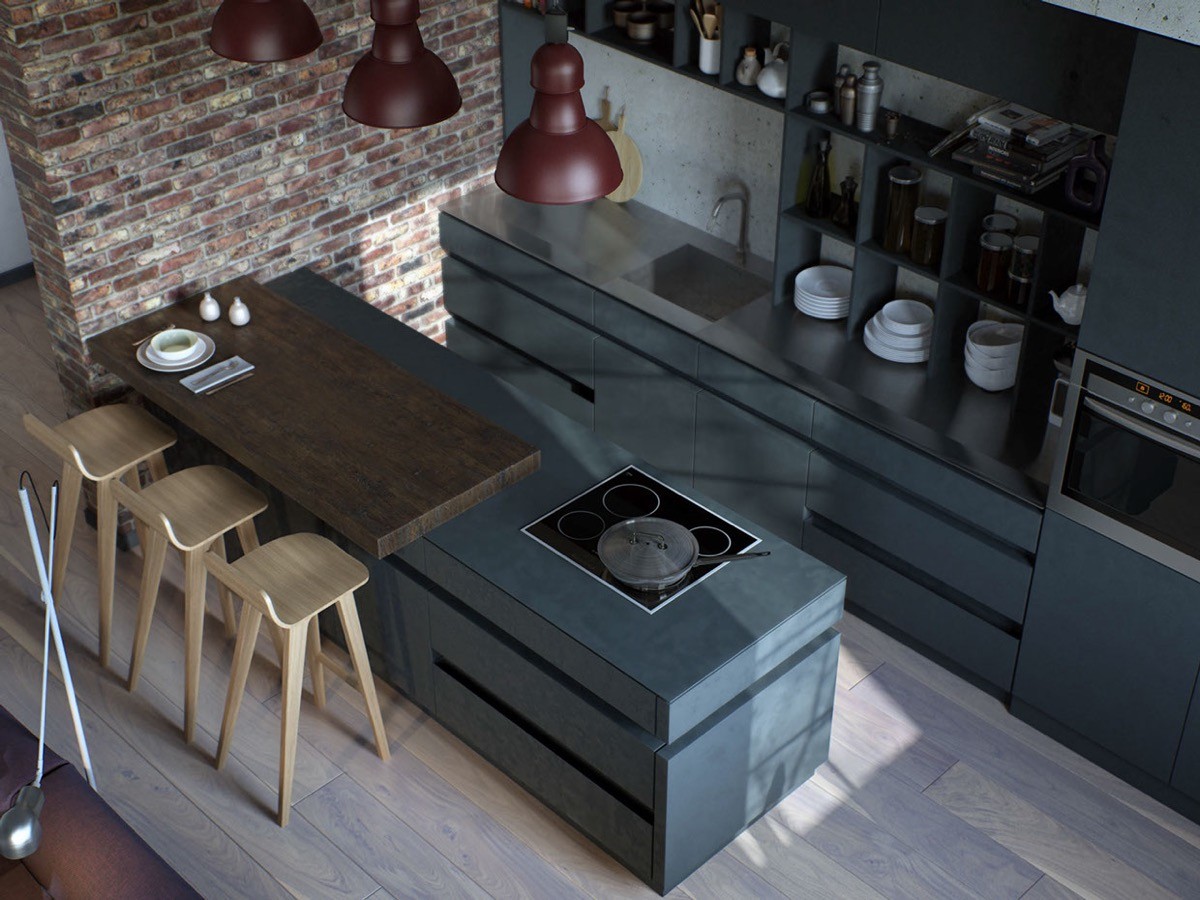 Create an overlapping dining top. This grey kitchen bench is overlapped by a dark wooden top with an overhang, to create a comfortable and isolated dining spot.